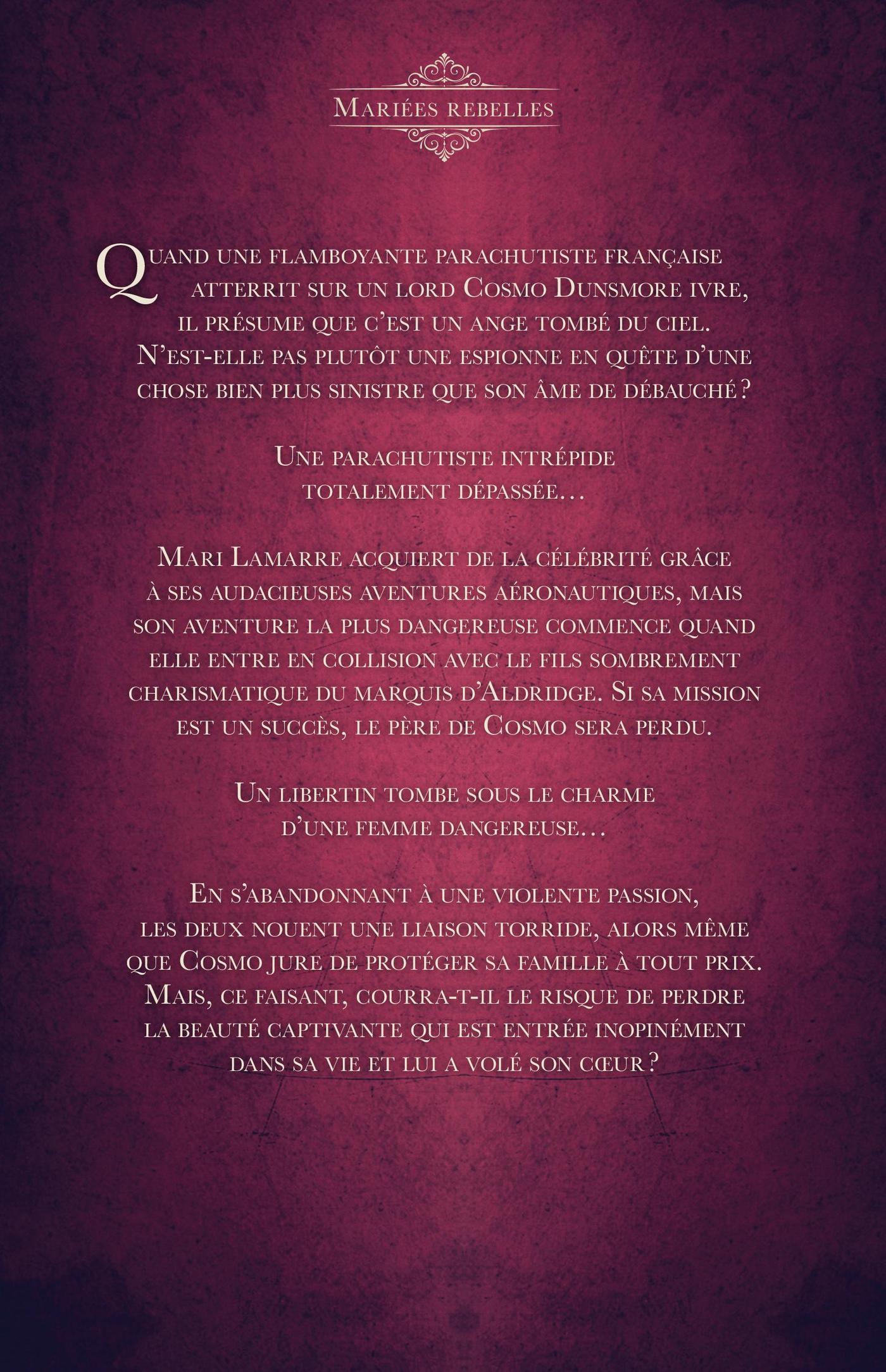 Un roman d’espionnage de l’époque de la RégenceQuand une flamboyante parachutiste française atterrit sur un lord Cosmo Dunsmore ivre, il présume que c’est un ange tombé du ciel. N’est-elle pas plutôt une espionne en quête d’une chose bien plus sinistre que son âme de débauché? Une parachutiste intrépide totalement dépassée…Mari Lamarre acquiert de la célébrité grâce à ses audacieuses aventures aéronautiques, mais son aventure la plus dangereuse commence quand elle entre en collision avec le fils sombrement charismatique du marquis d’Aldridge. Si sa mission est un succès, le père de Cosmo sera perdu.Un libertin tombe sous le charme d’une femme dangereuse…En s’abandonnant à une violente passion, les deux nouent une liaison torride, alors même que Cosmo jure de protéger sa famille à tout prix. Mais, ce faisant, courra-t-il le risque de perdre la beauté captivante qui est entrée inopinément dans sa vie et lui a volé son coeur?