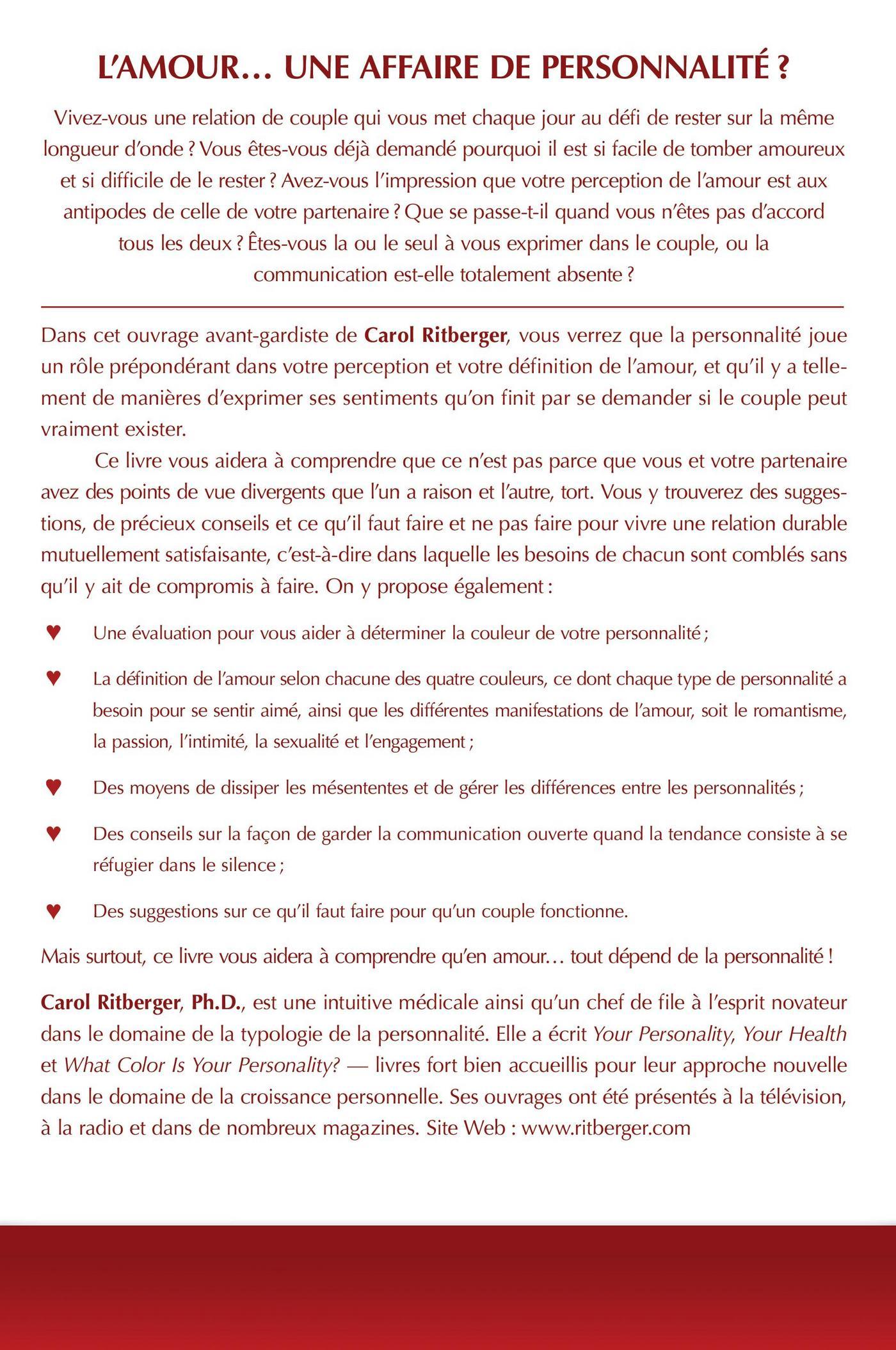 Dans cet ouvrage révolutionnaire de Carol Ritberger, vous verrez que la personnalité joue un rôle prépondérant dans votre perception et votre définition de l’amour et qu’il y a tellement de manières d’exprimer ses sentiments qu’on finit par se demander si le couple peut vraiment exister. Ce livre vous aidera à comprendre que ce n’est pas parce que vous et votre conjoint avez despoints de vue divergents que l’un a raison et l’autre, tort. Vous y trouverez des suggestions, des conseils et ce qu’il faut faire et ne pas faire pour vivre une relation durable mutuellement satisfaisante, c’est-à-dire dans laquelle les besoins de chacun sont comblés sans qu’il y ait de compromis à faire.