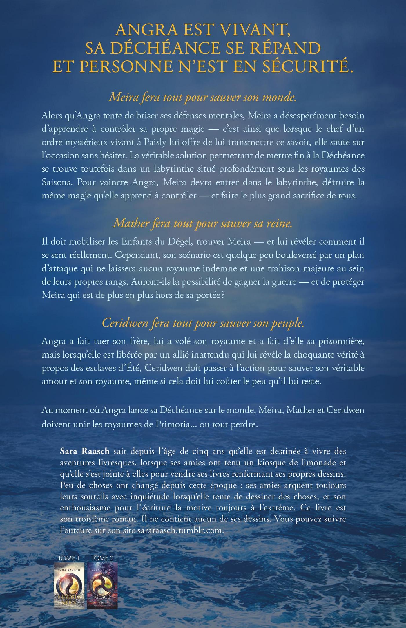 Meira fera tout pour sauver son monde.Alors qu'Angra tente de briser ses défenses mentales, Meira a désespérément besoin d'apprendre à contrôler sa propre magie — c'est ainsi que lorsque le chef d'un ordre mystérieux vivant à Paisly lui offre de lui transmettre ce savoir, elle saute sur l'occasion sans hésiter. La véritable solution permettant de mettre fin à la Déchéance se trouve toutefois dans un labyrinthe situé profondément sous les royaumes des Saisons. Pour vaincre Angra, Meira devraentrer dans le labyrinthe, détruire la même magie qu'elle apprend à contrôler — et faire le plus grand sacrifice de tous.Mather fera tout pour sauver sa reine.Il doit mobiliser les Enfants du Dégel, trouver Meira – et lui révéler enfin comment il se sent réellement. Cependant, son scénario est quelque peu bouleversé par un plan d’attaque qui ne laissera aucun royaume indemne et par une trahison majeure au sein de leurs propres rangs. Auront-ils la possibilité de gagner la guerre ? – et de protéger Meira qui est de plus en plus hors de sa portée.Ceridwen fera tout pour sauver son peuple.Angra a fait tuer son frère, lui a volé son royaume et a fait d'elle sa prisonnière, mais lorsqu'elle est libérée par un allié inattendu qui lui révèle la choquante vérité à propos des esclaves d'Été, Ceridwen doit passer à l'action pour sauver son véritable amour et son royaume, même si cela doit lui coûter le peu qui lui reste.Au moment où Angra lance sa Déchéance sur le monde, Meira, Mather et Ceridwen doivent unir les royaumes de Primoria... ou tout perdre.