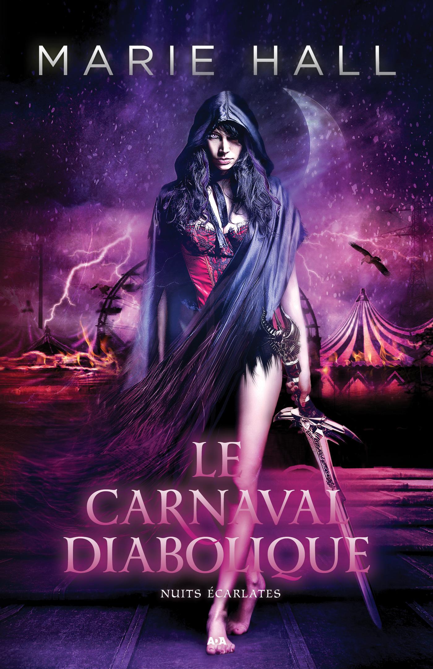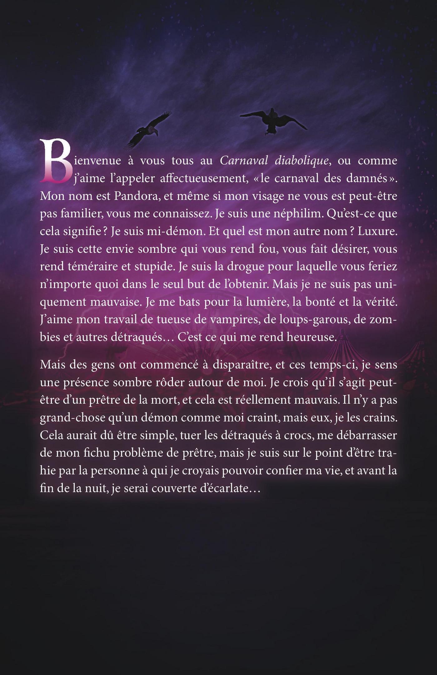 Bienvenue à vous tous au Carnaval Diabolique, ou comme j’aime l’appeler affectueusement, le carnaval des damnés. Mon nom est Pandora, et même si mon visage ne vous est peut-être pas familier, vous me connaissez. Je suis une Nephilim. Qu’est-ce que cela signifie? Je suis mi-démon. Et quel est mon autre nom? Luxure. Je suis cette envie sombre qui vous rend fou, vous fait désirer, vous rend téméraires et stupides. Je suis la drogue que vous feriez n’importe quoi pour obtenir. Mais je ne suis pas uniquement mauvaise. Je me bats pour la lumière, la bonté et la vérité.J’aime mon travail de tueuse de vampires, de loups-garous, de zombies et autres détraqués… C’est ce qui me rend heureuse. Mais des gens ont commencé à disparaître, et dernièrement, je sens une présence sombre rôder autour de moi. Je crois qu’il s’agit peut-être d’un prêtre de la mort et cela est réellement mauvais. Il n’y a pas grand-chose qu’un démon comme moi craint, mais eux, je les crains. Cela aurait dû être simple, tuer les détraqués à crocs, me débarrasser de mon fichu problème de prêtre, mais je suis sur le point d’être trahie par la personne à qui je croyais pouvoir confier ma vie, et avant la fin de la nuit je serai couverted’écarlate…