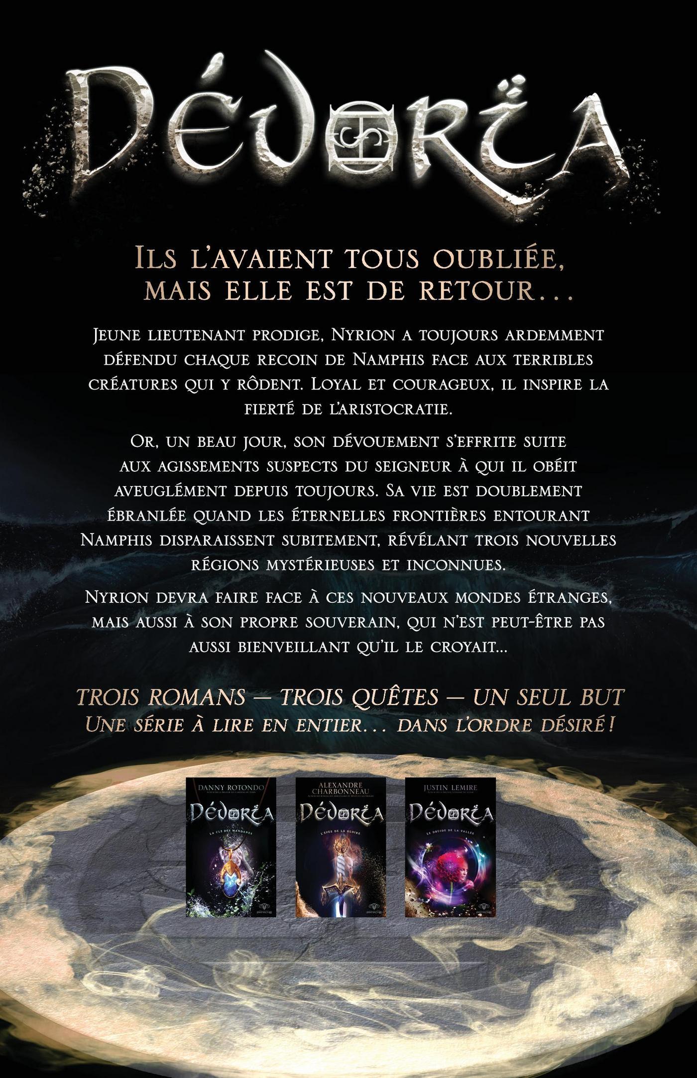 Ils l’avaient tous oubliée, mais elle est de retour…* * *Jeune lieutenant prodige, Nyrion a toujours ardemment défendu chaque recoin de Namphis face aux terribles créatures qui y rôdent. Loyal et courageux, il inspire la fierté de l’aristocratie.Un beau jour, son dévouement s’effrite suite aux agissements suspects du seigneur à qui il obéit aveuglément depuis toujours. Sa vie est doublement ébranlée quand les éternelles frontières entourant Namphis disparaissent subitement, révélant trois nouvelles régions mystérieuses et inconnues.Nyrion devra faire face à ces nouveaux mondes étranges, mais aussi à son propre souverain, qui n’est peut-être pas aussi bienveillant qu’il le croyait...Trois romans – Trois quêtes – Un seul butUne série à lire en entier… dans l’ordre désiré!