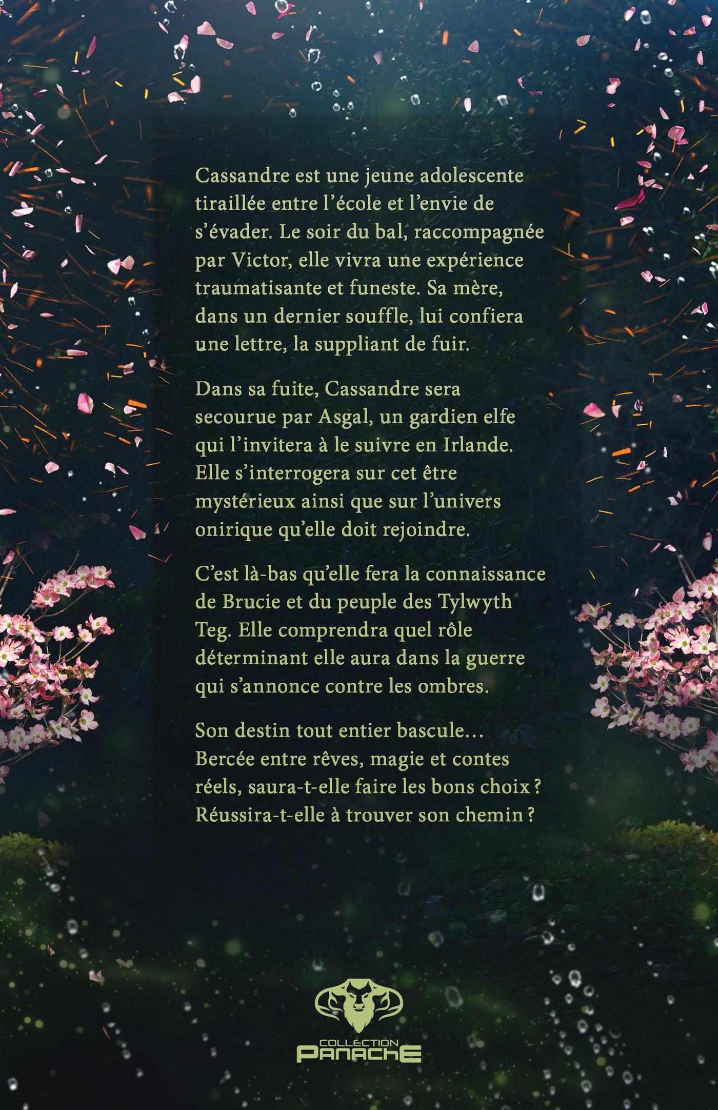 Cassandre est une jeune adolescente tiraillée entre l’école et l’envie de s’évader. Le soir du bal, raccompagnée par Victor, elle vivra une expérience traumatisante et funeste. Sa mère, dans un dernier souffle, lui confiera une lettre, la suppliant de fuir.Dans sa fuite, Cassandre sera secourue par Asgal un gardien elfe qui l’invitera à le suivre en Irlande. Elle s’interrogera sur cet être mystérieux ainsi que sur l’univers onirique qu’elle doit rejoindre.C’est là-bas qu’elle fera la connaissance de Brucie et du peuple des Tylwyth teg. Elle comprendra quel rôle déterminant elle aura dans la guerre qui s’annonce contre les ombres.Son destin tout entier bascule… bercée entre rêves, magie et contes réels, saura-t-elle faire les bons choix?Réussira-t-elle à trouver son chemin ?