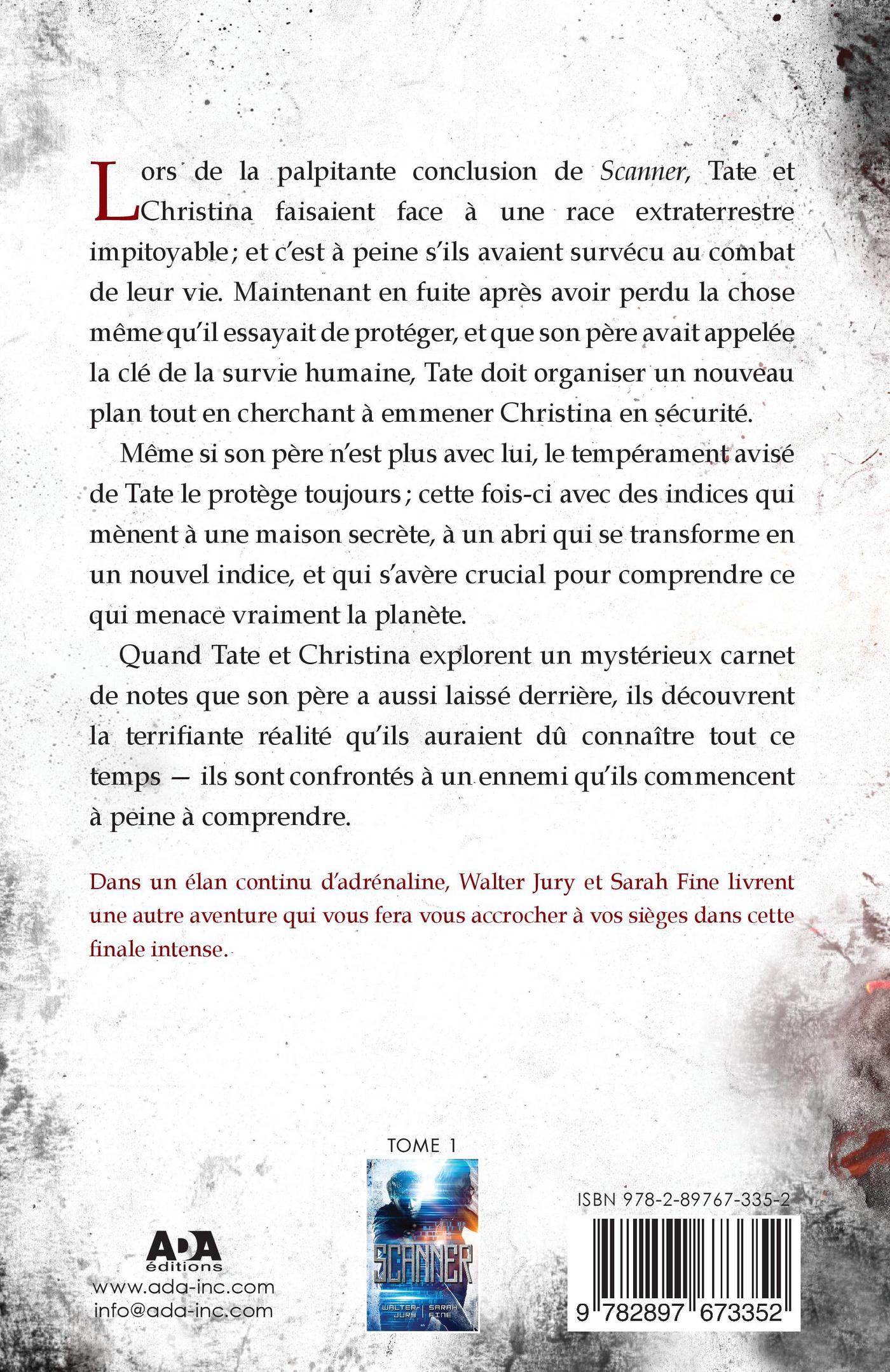 Lors de la palpitante conclusion de Scanner, dans le combat de leur vie, Tate et Christina faisaient face à une race extra-terrestre impitoyable; et c’est à peine s’ils avaient survécu. Maintenant en fuite, après avoir perdu la chose même qu’il essayait de protéger — et que son père avait appelée la clé de la survie humaine, Tate doit organiser un nouveau plan tout en cherchant à emmener Christina en sécurité.Même si son père n’est plus avec lui, sa nature prête au pire protège toujours Tate; cette fois-ci avec des indices qui mènent à une maison secrète, à un abri qui se transforme en un nouvel indice, et qui s’avère crucial pour comprendre ce qui menace vraiment la planète.Quand Tate et Christina explorent un mystérieux carnet de notes que son père a aussi laissé derrière, ils découvrent la terrifante réalité qu’ils auraient dû connaître tout ce temps — ils sont confrontés à un ennemi qu’ils commencent à peine comprendre.Dans un élan continu d’adrénaline, Walter Jury et Sarah Fine livrent une autre aventure qui vous fera vous accrocher à vos sièges dans cette fnale intense.