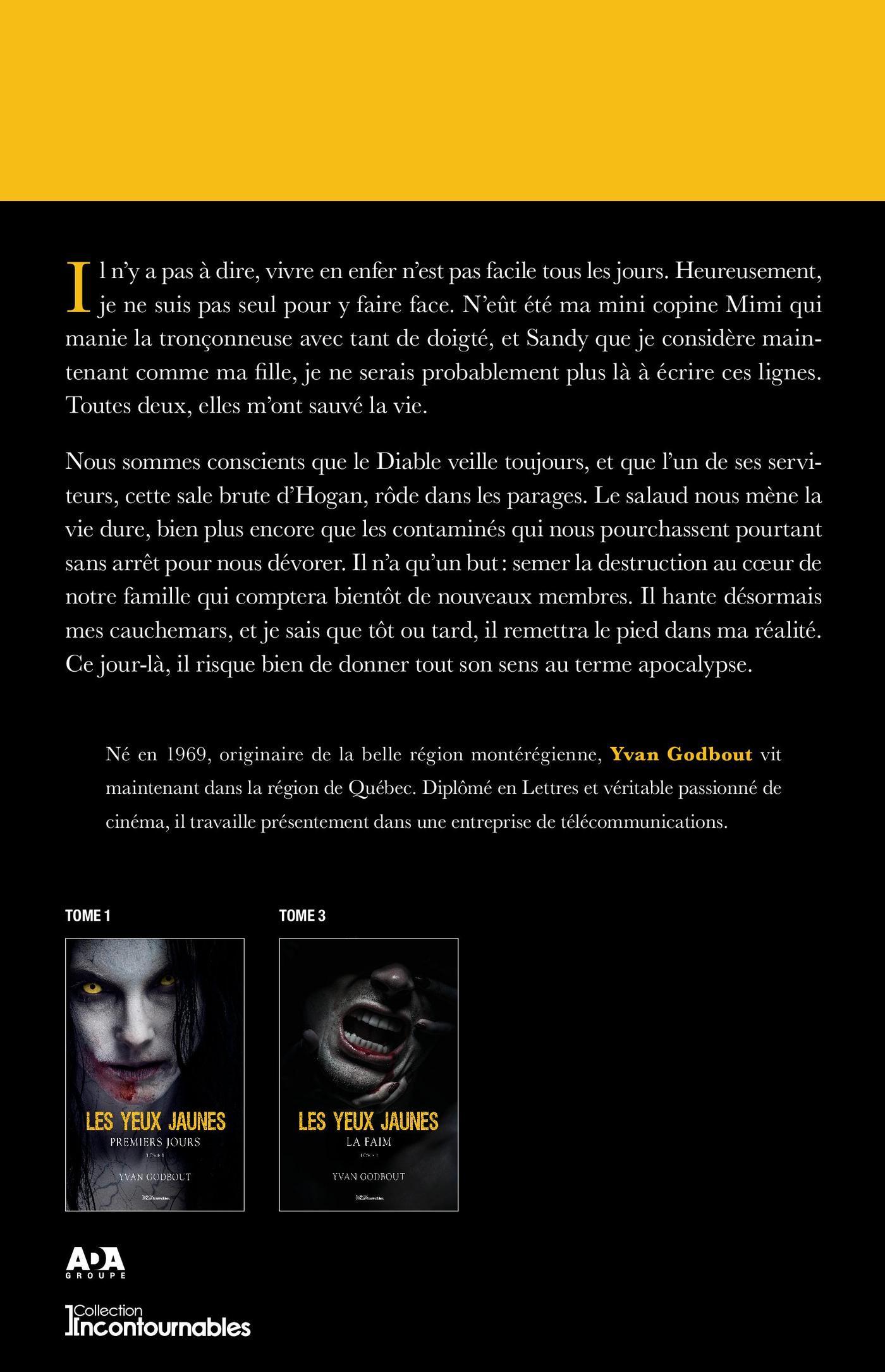 Il n’y a pas à dire, vivre en enfer n’est pas facile tous les jours. Heureusement, je ne suis pas seule pour y faire face. N’eût été ma mini copine Mimi qui manie la tronçonneuse avec tant de doigté, et Sandy que je considère maintenant comme ma fille, je ne serais probablement plus là à écrire ces lignes. Toutes deux, elles m’ont sauvé la vie.Nous sommes conscients que le Diable veille toujours, et que l’un de ses serviteurs, cette sale brute d’Hogan, rôde dans les parages. Le salaud nous mène la vie dure, bien plus encore que les contaminés qui nous pourchassent pourtant sans arrêt pour nous dévorer. Il n’a qu’un but : semer la destruction au coeur de notre famille qui comptera bientôt de nouveaux membres. Il hante désormais mes cauchemars, et je sais que tôt ou tard, il remettra le pied dans ma réalité. Ce jour-là, il risque bien de donner tout son sens au terme apocalypse.