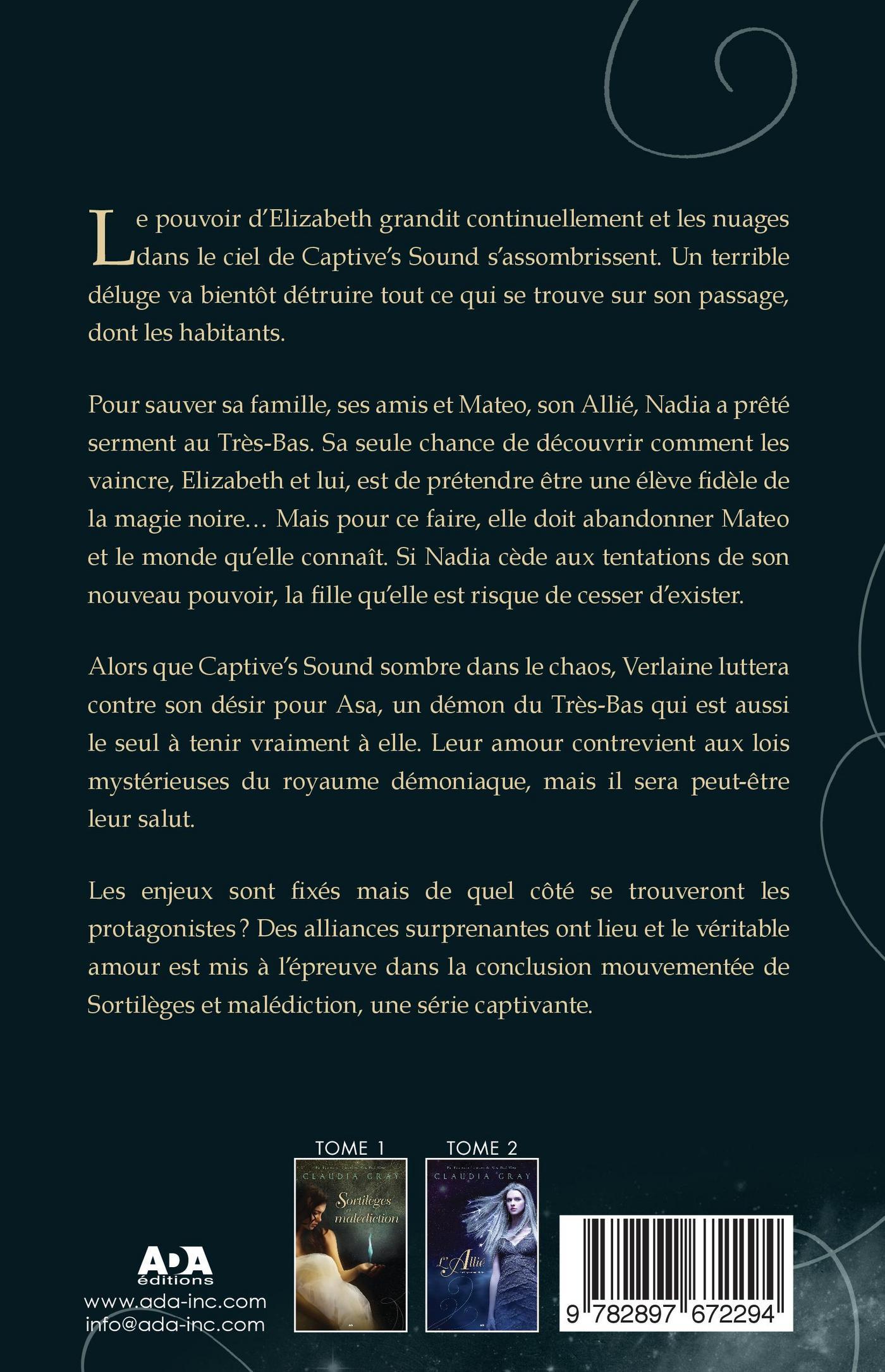 Le pouvoir d’Elizabeth grandit continuellement et les nuages dans le ciel de Captive’s Sound s’assombrissent. Un terrible déluge va bientôt détruire tout ce qui se trouve sur son passage, dont les habitants.Pour sauver sa famille, ses amis et Mateo, son Allié, Nadia a prêté serment au Très-Bas. Sa seule chance de découvrir comment les vaincre, Elizabeth et lui, est de prétendre être une élève fdèle de la magie noire… Mais pour ce faire, elle doit abandonner Mateo et le monde qu’elle connaît. Si Nadia cède aux tentations de son nouveau pouvoir, la flle qu’elle est risque de cesser d’exister.Alors que Captive’s Sound sombre dans le chaos, Verlaine luttera contre son désir pour Asa, un démon du Très-Bas qui est aussi le seul à tenir vraiment à elle. Leur amour contrevient aux lois mystérieuses du royaume démoniaque, mais il sera peut-être leur salut.Les enjeux sont fxés mais de quel côté se trouveront les protagonistes? Des alliances surprenantes ont lieu et le véritable amour est mis à l’épreuve dans la conclusion mouvementée de Sortilèges et malédiction, une série captivante.