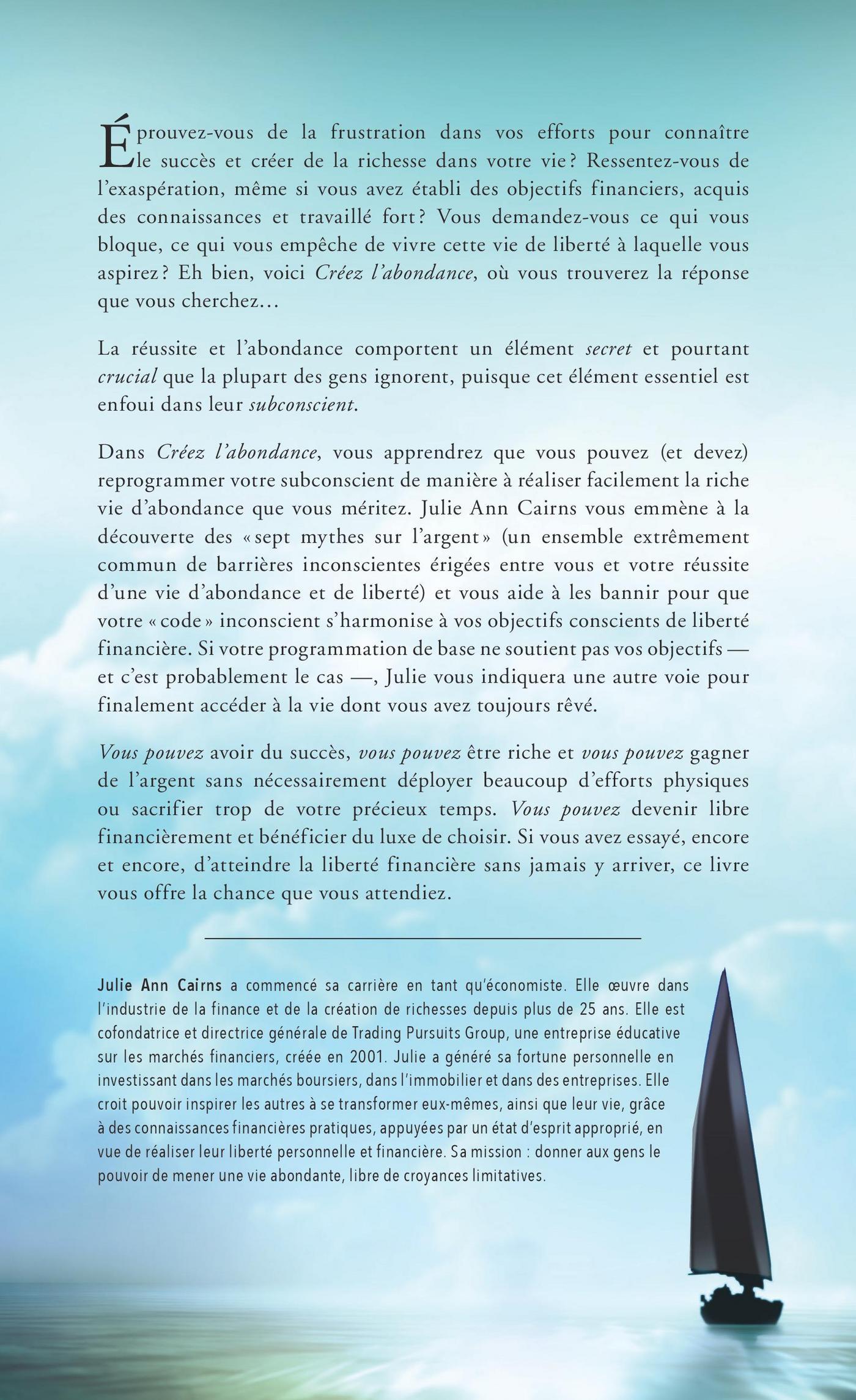 prouvez-vous de la frustration dans vos efforts pour connaître le succès et pour créer de la richesse ? Ressentez-vous de l’exaspération, même si vous avez établi des objectifs financiers, acquis des connaissances et travaillé fort ? Vous demandez-vous ce qui vous bloque, ce qui vous empêche de vivre cette vie de liberté à laquelle vous aspirez? Eh bien, voici Créez l’abondance, où vous trouverez la réponse que vous cherchez…La réussite et l’abondance ont un élément secret et pourtant crucial que la plupart des gens ignorent puisque cet élément essentiel est enfoui dans leur subconscient.Dans Créez l’abondance, vous apprendrez que vous pouvez (et devez) reprogrammer votre subconscient de manière à avoir facilement la riche vie d’abondance que vous méritez. Julie Ann Cairns vous emmène à la découverte des «7 mythes sur l’argent» — un ensemble extrêmement commun de barrières inconscientes érigées entre vous et votre réussite d’une vie d'abondance et de liberté — et vous aide à les bannir pour que votre «code» inconscient s’harmonise à vos objectifs conscients de liberté financière. Si votre programmation de base ne soutient pas vos objectifs — et c’est probablement le cas — Julie vous indiquera une autre voie pour finalement accéder à la vie dont vous avez toujours rêvé.Vous pouvez avoir du succès, vous pouvez être riche et vous pouvez gagner de l’argent sans nécessairement déployer beaucoup d’efforts physiques ou sacrifier votre précieux temps. Vous pouvez devenir libre financièrement et bénéficier du luxe de choisir. Si vous avez essayé, encore et encore, d’atteindre la liberté financière sans jamais y arriver, ce livre vous offre la chance que vous attendiez.