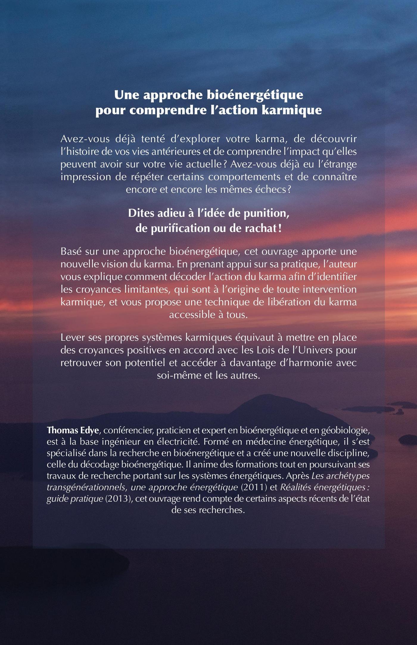 Avez-vous déjà tenté d’explorer votre karma, de découvrir l’histoire de vos vies antérieures et de comprendre l’impact qu’elles peuvent avoir sur votre vie présente? Avez-vous déjà éprouvé le sentiment de vivre ou revivre un schéma de fonctionnement identique menant à une même souffrance? Avez-vous déjà eu l’impression étrange de répéter les mêmes erreurs conduisant à de semblables résultats? Ce guide apporte des réponses à ces questions. Le karma agit sur l’ensemble des incarnations de l’âme. Les souffrances et limitations qu’il induit obligent à découvrir sa raison d’être au présent. Ses protagonistes, les gardiens du karma, guident vers la compréhension de l’action karmique, action qui ne cherche rien d’autre que l’évolution et l’élévation en conscience de l’âme. Exit l’idée de punition karmique, de purification oude rachat du karma ! Partant d’une approche bioénergétique, l’auteur s’appuie sur de nombreux exemplespour montrer comment intervient le karma afin d’obliger un être à vivre selon ses croyances, cela dans le seul but de le faire évoluer. Il explique le fonctionnement des systèmes d’ordre karmique et propose une technique de libération de leur emprise qui est accessible à tous. Lever ses propres systèmes karmiques pour accéder à davantage de bien-être et vivre en pleine conscience équivaut à installer de nouvelles croyances mieux en accord avec les Lois de l’Univers.