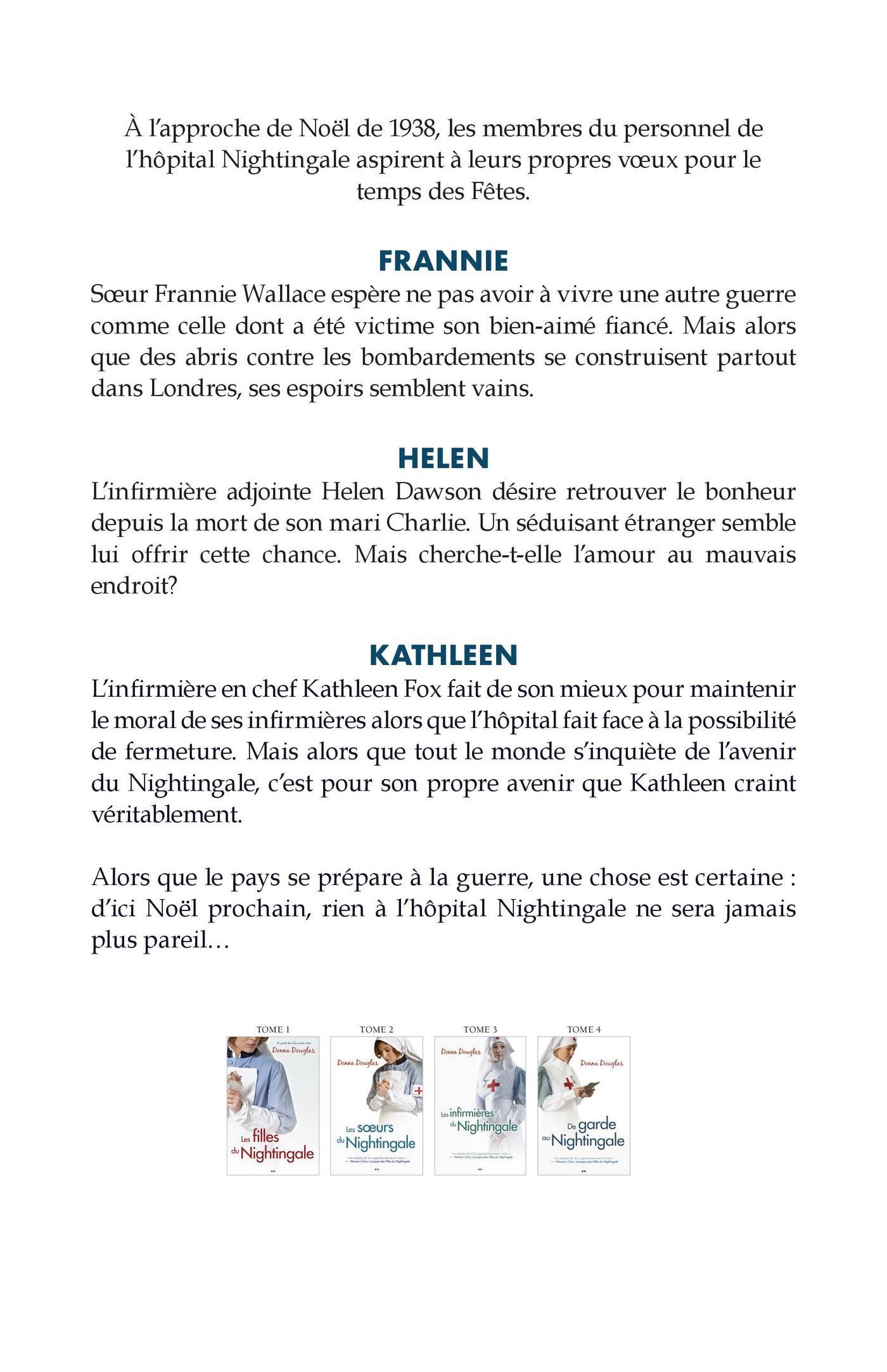 À l’approche de Noël de 1938, les membres du personnel de l’hôpital Nightingale aspirent à leurs propres voeux pour le temps des Fêtes.Soeur Frannie Wallace espère ne pas avoir à vivre une autre guerre comme celle dont a été victime son bien-aimé fiancé. Mais alors que des abris contre les bombardements se construisent partout dans Londres, ses espoirs semblent vains.L’infirmière adjointe Helen Dawson désire retrouver le bonheur depuis la mort de sonmari Charlie. Un séduisant étranger semble lui offrir cette chance. Mais cherche-t-ellel’amour au mauvais endroit? L’infirmière en chef Kathleen Fox fait de son mieux pour maintenir le moral de ses infirmières alors que l’hôpital fait face à la possibilité de fermeture. Mais alors que tout le monde s’inquiète de l’avenir du Nightingale, c’est pour son propre avenir que Kathleen craint véritablement.Alors que le pays se prépare à la guerre, une chose est certaine: d’ici Noël prochain, rien à l’hôpital Nightingale ne sera jamais plus pareil…