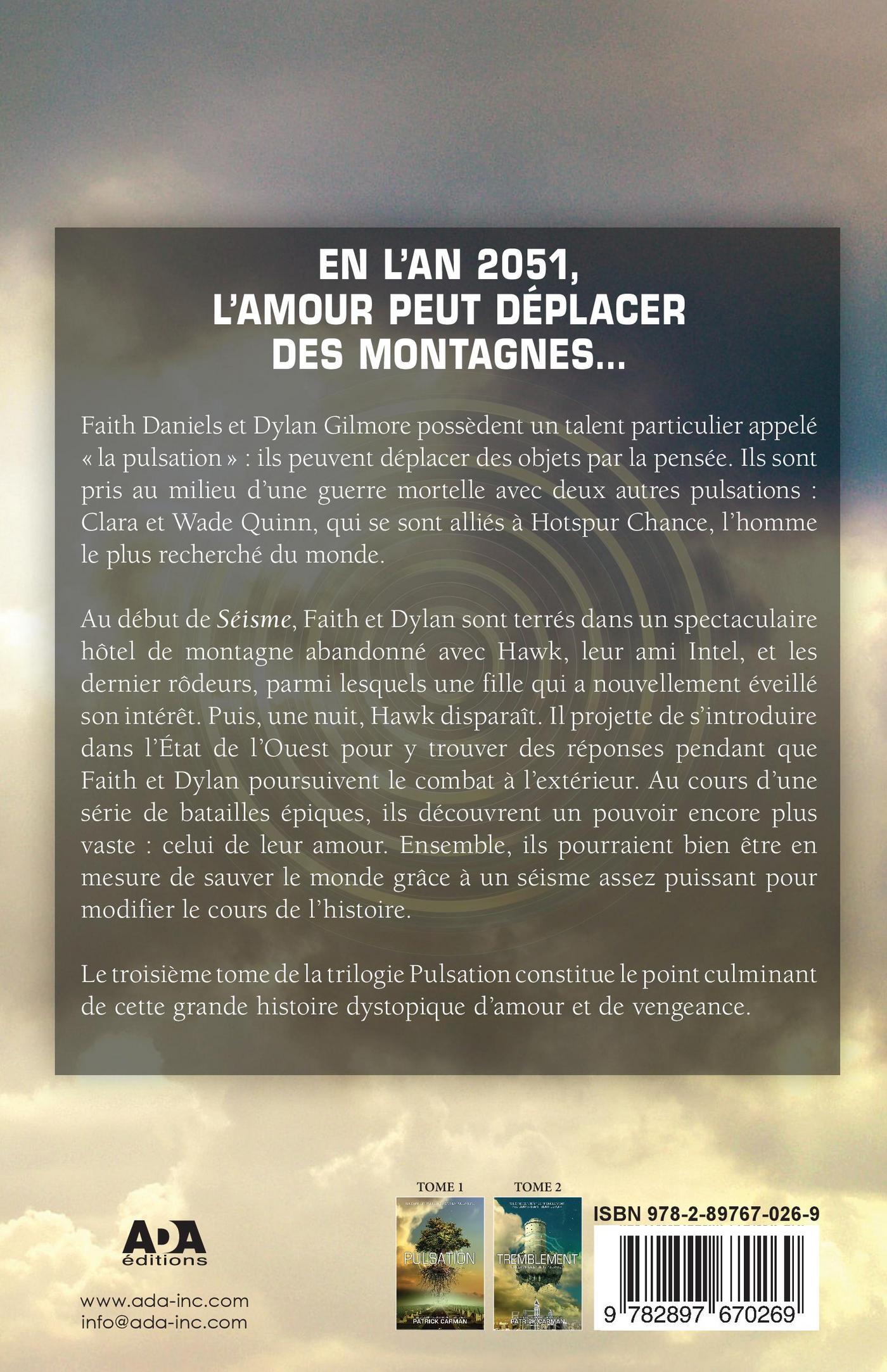 En l’an 2051, l’amour peut déplacer des montagnes…Faith Daniels et Dylan Gilmore possèdent un talent particulier appelé «la pulsation»: ilspeuvent déplacer des objets par la pensée. Ils sont pris au milieu d’une guerre mortelle avecdeux autres pulsations: Clara et Wade Quinn, qui se sont alliés à Hotspur Chance, l’hommele plus recherché du monde.Au début de Séisme, Faith et Dylan sont terrés dans un spectaculaire hôtel de montagne abandonné avec Hawk, leur ami Intel, et les dernier rôdeurs, parmi lesquels une fille qui a nouvellement éveillé son intérêt. Puis, une nuit, Hawk disparaît. Il projette de s’introduire dans l’État de l’Ouest pour y trouver des réponses pendant que Faith et Dylan poursuivent le combat à l’extérieur. Au cours d’une série de batailles épiques, ils découvrent un pouvoirencore plus vaste: celui de leur amour. Ensemble, ils pourraient bien être en mesure de sauver le monde grâce à un séisme assez puissant pour modifier le cours de l’histoire.Le troisième tome de la trilogie Pulsation constitue le point culminant de cette grande histoire dystopique d’amour et de vengeance.