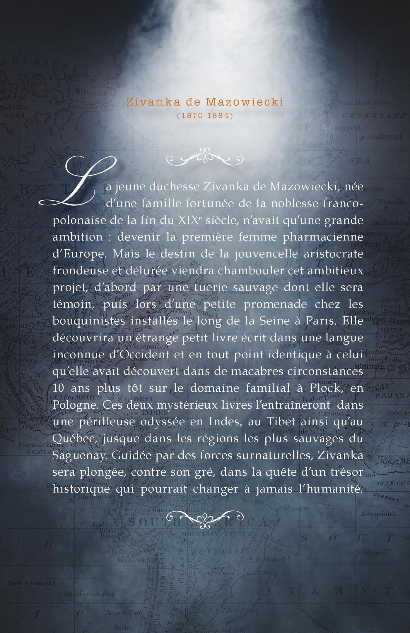 La jeune duchesse Zivanka de Mazowiecki, née d’une famille fortunée de la noblesse francopolonaise de la fin du XIXe siècle, n’avait qu’une grande ambition: devenir la première femme pharmacienne d’Europe. Mais le destin de la jouvencelle aristocratefrondeuse et délurée viendra chambouler cet ambitieux projet, d’abord par une tuerie sauvage dont elle sera témoin, puis lors d’une petite promenade chez les bouquinistes installés le long de la Seine à Paris. Elle découvrira un étrange petit livre écrit dans une langue inconnue d’Occident et en tout point identique à celui qu’elle avait découvert dans de macabres circonstances10 ans plus tôt sur le domaine familial à Plock, en Pologne. Ces deux mystérieux livres l’entraîneront dans une périlleuse odyssée en Indes, au Tibet ainsi qu’auQuébec, jusque dans les régions les plus sauvages du Saguenay. Guidée par des forces surnaturelles, Zivanka sera plongée, contre son gré, dans la quête d’un trésorhistorique qui pourrait changer à jamais l’humanité.