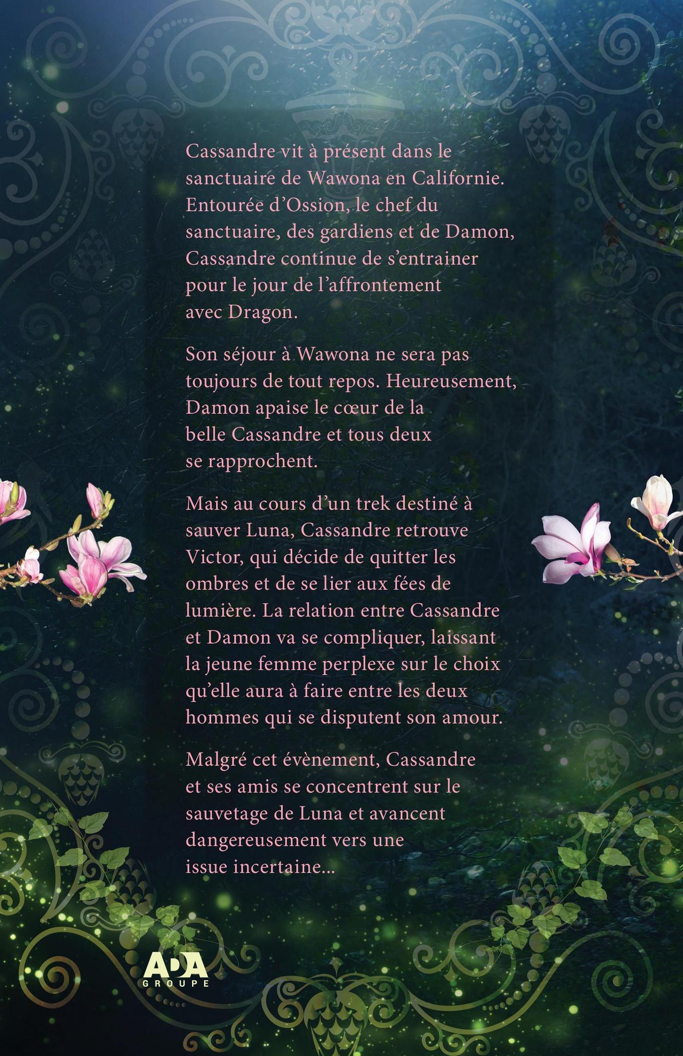 Cassandre vit à présent dans le sanctuaire de Wawona en Californie. Entourée d’Ossion, le chef du sanctuaire, des gardiens et de Damon, Cassandre continue de s’entrainer pour le jour de l’affrontement avec Dragon.Son séjour à Wawona ne sera pas toujours de tout repos. Heureusement, Damon apaise le coeur de la belle Cassandre et tous deux se rapprochent.Mais au cours d’un trek destiné à sauver Luna, Cassandre retrouve Victor, qui décide de quitter les ombres et de se lier aux fées de lumière. La relation entre Cassandre et Damon va se compliquer, laissant la jeune femme perplexe sur le choix qu’elle aura à faire entre les deux hommes qui se disputent son amour.Malgré cet évènement, Cassandre et ses amis se concentrent sur le sauvetage de Luna etavancent dangereusement vers une issue incertaine...