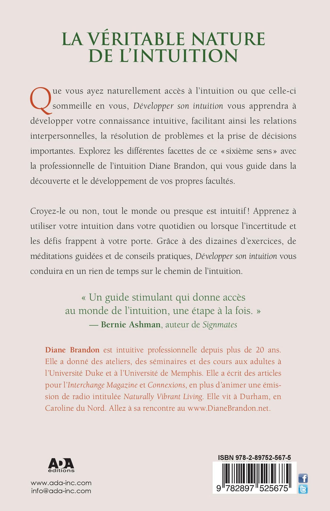 Que vous ayez naturellement accès à l’intuition ou que celle-ci sommeille en vous,L’intuition pour débutants vous apprendra à développer votre connaissance intuitive, facilitant ainsi les relations interpersonnelles, la résolution de problèmeset la prise de décisions importantes. Explorez les différentes facettes de ce «sixième sens» avec la professionnelle de l’intuition Diane Brandon, qui vous guide dans la découverte et le développement de vos propres facultés. Croyez-le ou non, tout le monde ou presque est intuitif! Apprenez à utiliser votre intuition dans votre quotidien ou lorsque l’incertitude et les défis frappent à votre porte. Grâce à des dizaines d’exercices, de méditations guidées et de conseils pratiques, L’intuition pour débutants vous conduira en un rien de temps sur le chemin de l’intuition.