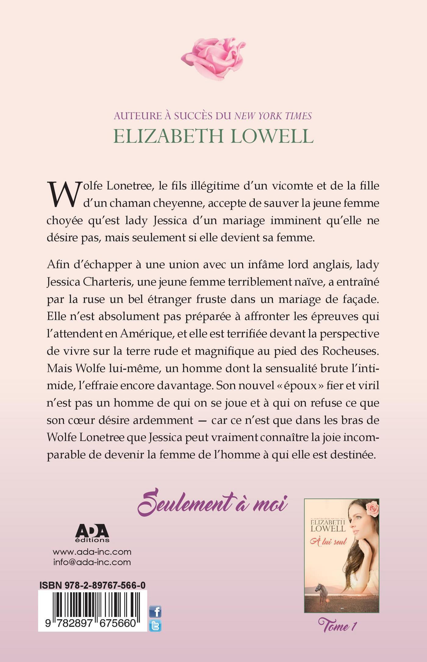 Afin d’échapper à une union avec un infâme lord anglais, lady Jessica Charteris, une jeune femme terriblement naïve a entraîné par la ruse un bel étranger fruste dans un mariage de façade. Elle n’est absolument pas préparée à affronter les épreuves qui l’attendent en Amérique et elle est terrifiée devant la perspective de vivre sur la terre rude et magnifique au pied des Rocheuses. Mais Wolfe lui-même, un homme dont la sensualité brute l’intimide, l’effraie encore davantage. Son nouvel «époux» fier et viril n’est pas un homme de qui on se joue et à qui on refuse ce que son coeur désire ardemment — car ce n’est que dans les bras de Wolfe Lonetree que Jessica peut vraiment connaître la joie incomparable de devenir la femme de l’homme à qui elle est destinée.
