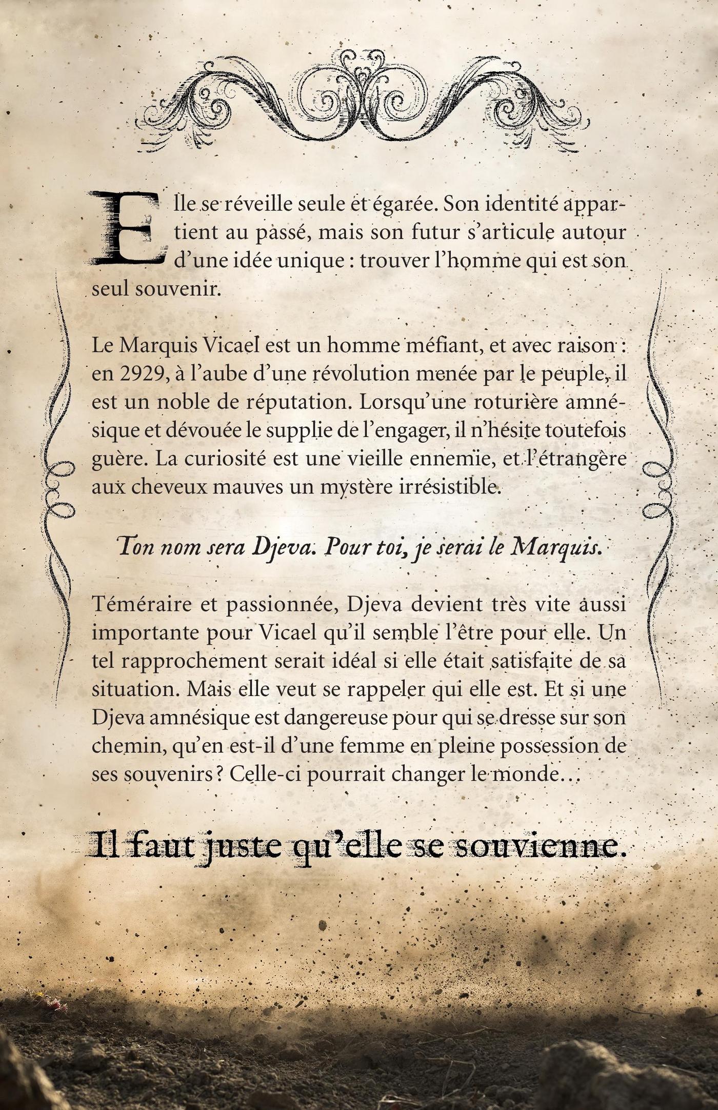Elle se réveille seule et égarée. Son identité appartient au passé, mais son futur s’articule autour d’une idée unique: trouver l’homme qui est son seul souvenir.Le Marquis Vicael est un homme méfiant, et avec raison: en 2929, à l’aube d’une révolution menée par le peuple, il est un noble de réputation. Lorsqu’une roturière amnésique et dévouée le supplie de l’engager, il n’hésite toutefois guère. La curiosité est une vieille ennemie, et l’étrangère aux cheveux mauves un mystère irrésistible.«Ton nom sera Djeva. Pour toi, je serai le Marquis.» Téméraire et passionnée, Djeva devient très vite aussi importante pour Vicael qu’il semble l’être pour elle. Un tel rapprochement serait idéal si elle était satisfaite de sa situation. Mais elle veut se rappeler qui elle est. Et si une Djeva amnésique est dangereuse pour qui se dresse sur son chemin, qu’en est-il d’une femme en pleine possession de ses souvenirs? Celle-ci pourrait changer le monde…Il faut juste qu’elle se souvienne.