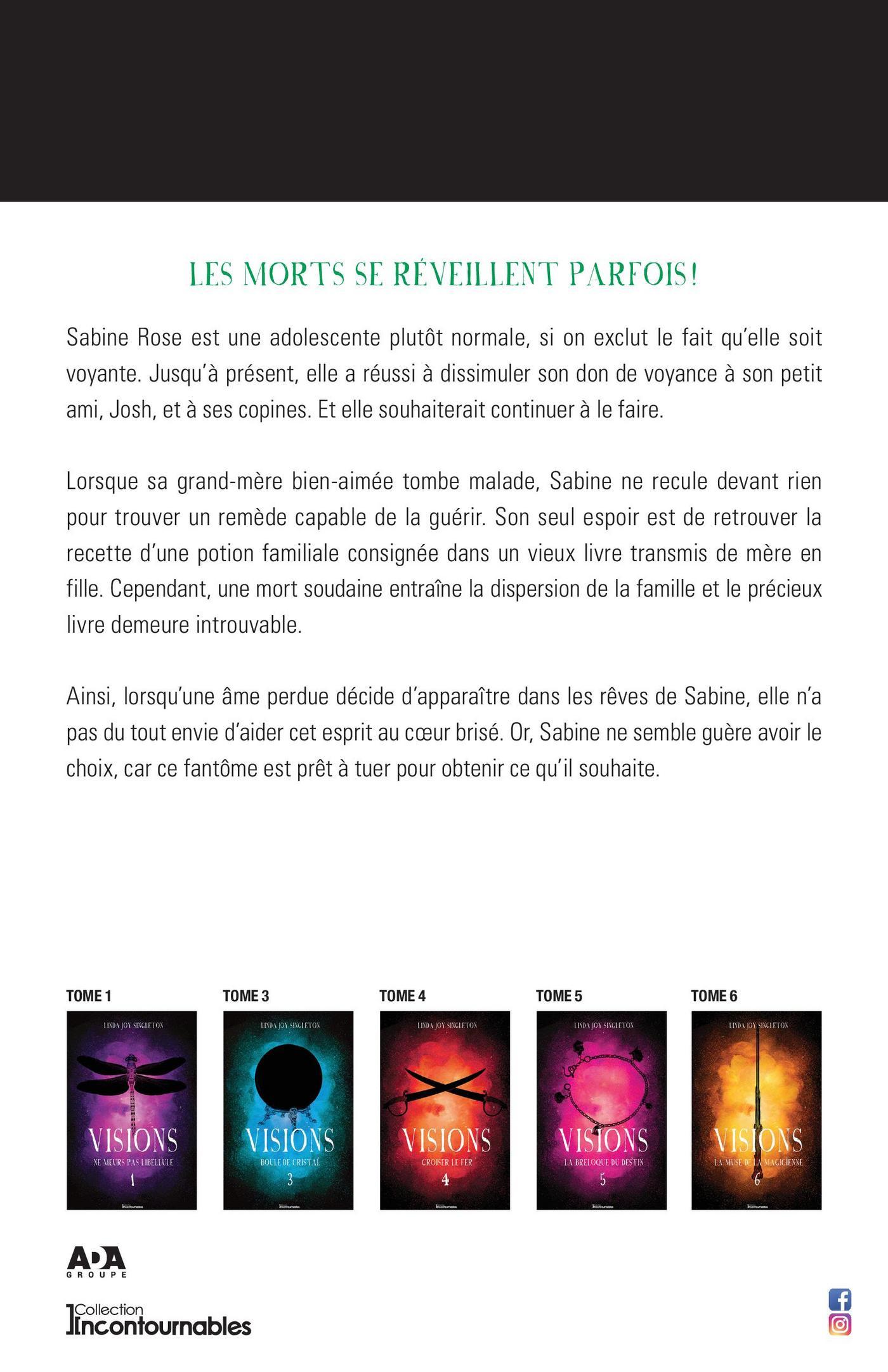 Les morts se réveillent parfois!Sabine Rose est une adolescente plutôt normale, si on exclut le fait qu’elle soit voyante. Jusqu’à présent, elle a réussi à dissimuler son don de voyance à son petit ami, Josh, et à ses copines. Et elle souhaiterait continuer à le faire.Lorsque sa grand-mère bien-aimée tombe malade, Sabine ne recule devant rien pour trouver un remède capable de la guérir. Son seul espoir est de retrouver la recette d’une potion familiale consignée dans un vieux livre transmis de mère en fille. Cependant, une mort soudaine entraîne la dispersion de la famille et le précieux livre demeure introuvable.Ainsi, lorsqu’une âme perdue décide d’apparaître dans les rêves de Sabine, elle n’a pas du tout envie d’aider cet esprit au cœur brisé. Or, Sabine ne semble guère avoir le choix, car ce fantôme est prêt à tuer pour obtenir ce qu’il souhaite.