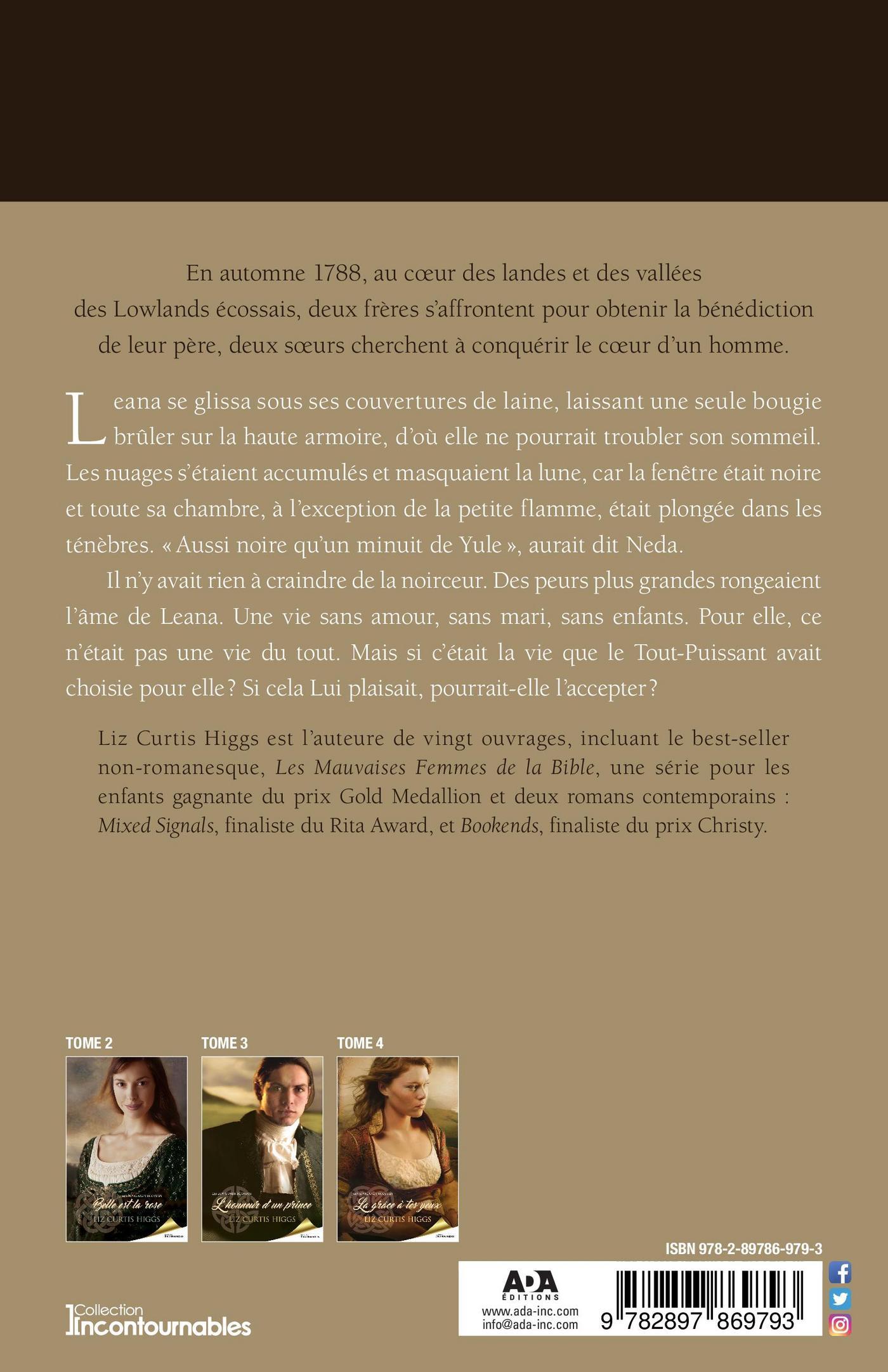 En automne 1788, au coeur des landes et des vallées des Lowlands écossais, deux frères s’affrontent pour obtenir la bénédiction de leur père, deux soeurs cherchent à conquérir le coeur d’unhomme.Leana se glissa sous ses couvertures de laine, laissant une seule bougie brûler sur la haute armoire, d’où elle ne pourrait troubler son sommeil. Les nuages s’étaient accumulés et masquaient la lune, car la fenêtre était noire et toute sa chambre, à l’exception de la petite flamme, était plongée dans les ténèbres. «Aussi noire qu’un minuit de Yule», aurait dit Neda.Il n’y avait rien à craindre de la noirceur. Des peurs plus grandes rongeaient l’âme de Leana. Une vie sans amour, sans mari, sans enfants. Pour elle, ce n’était pas une vie du tout. Mais si c’était la vie que le Tout-Puissant avait choisie pour elle? Si cela Lui plaisait, pourrait-elle l’accepter?
