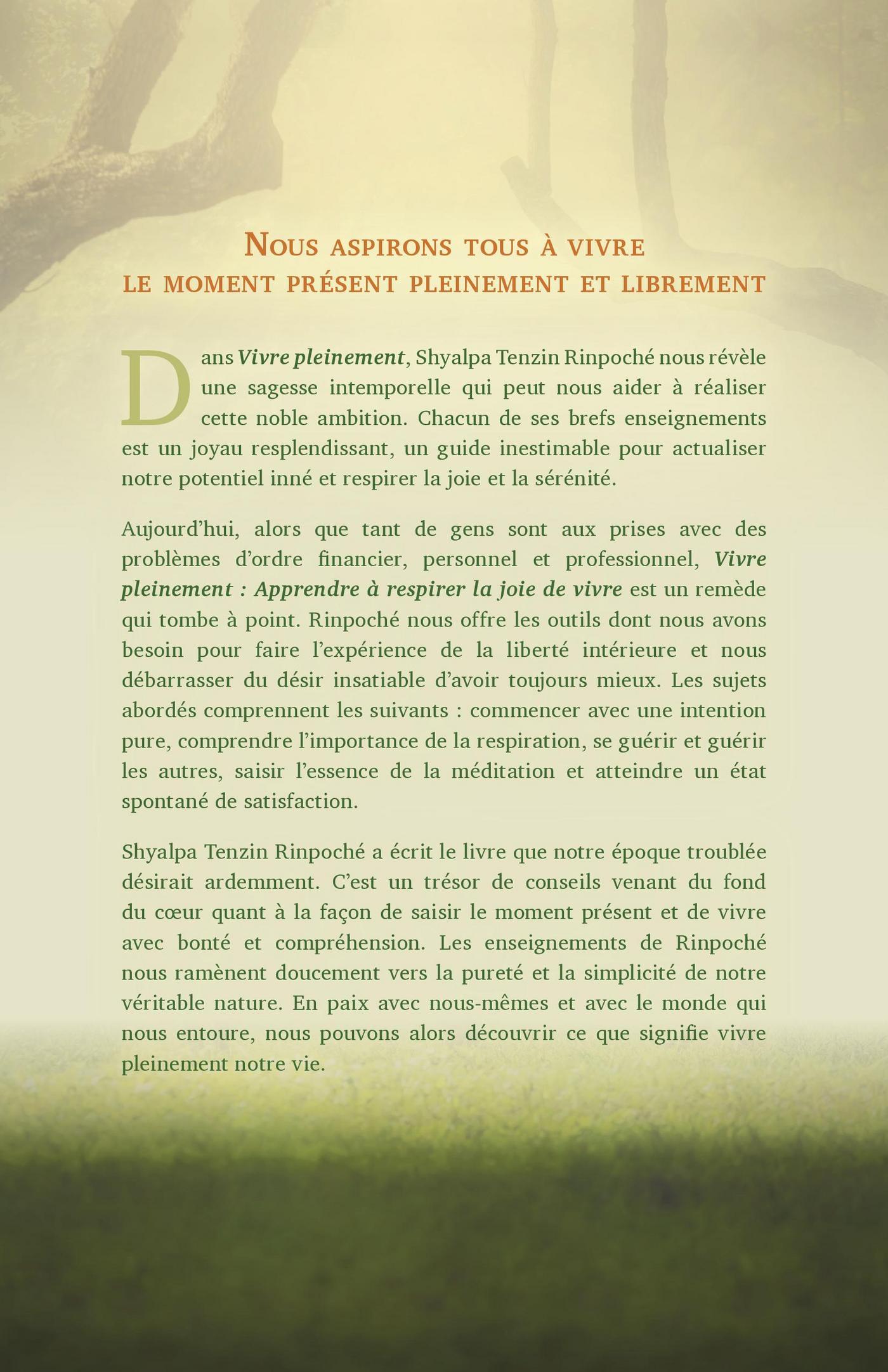 Nous aspirons tous à vivre pleinement et librement le moment présentDans Vivre pleinement, Shyalpa Tenzin Rinpoché nous révèle une sagesse intemporelle qui peut nous aider à réaliser cette noble ambition. Chacun de ses brefs enseignements est un joyau resplendissant, un guide inestimable pour actualiser notre potentiel inné et respirer la joie et la sérénité.Aujourd’hui, alors que tant de gens sont aux prises avec des problèmes d’ordre financier, personnel et professionnel, Vivre pleinement : Apprendre à respirer la joie de vivre est un remède qui tombe à point. Rinpoché nous offre les outils dont nous avons besoin pour faire l’expérience de la liberté intérieure et nous débarrasser du désir insatiable d’avoir toujours mieux. Les sujets abordés incluent commencer avec une intention pure, comprendre l’importance de la respiration, se guérir et guérir les autres, saisir l’essence de la méditation et atteindre un état spontané de satisfaction.Shyalpa Tenzin Rinpoché a écrit le livre que notre époque troublée appelait de tous ses voeux. C’est un trésor de conseils venant du fond du coeur quant à la façon de saisir le moment présent et de vivre avec bonté et compréhension. Les enseignements de Rinpoché nous ramènent doucement vers la pureté et la simplicité de notre véritable nature. En paix avec nous-mêmes et avec le monde qui nous entoure, nous pouvons alors découvrir ce que signifie vivre pleinement notre vie.