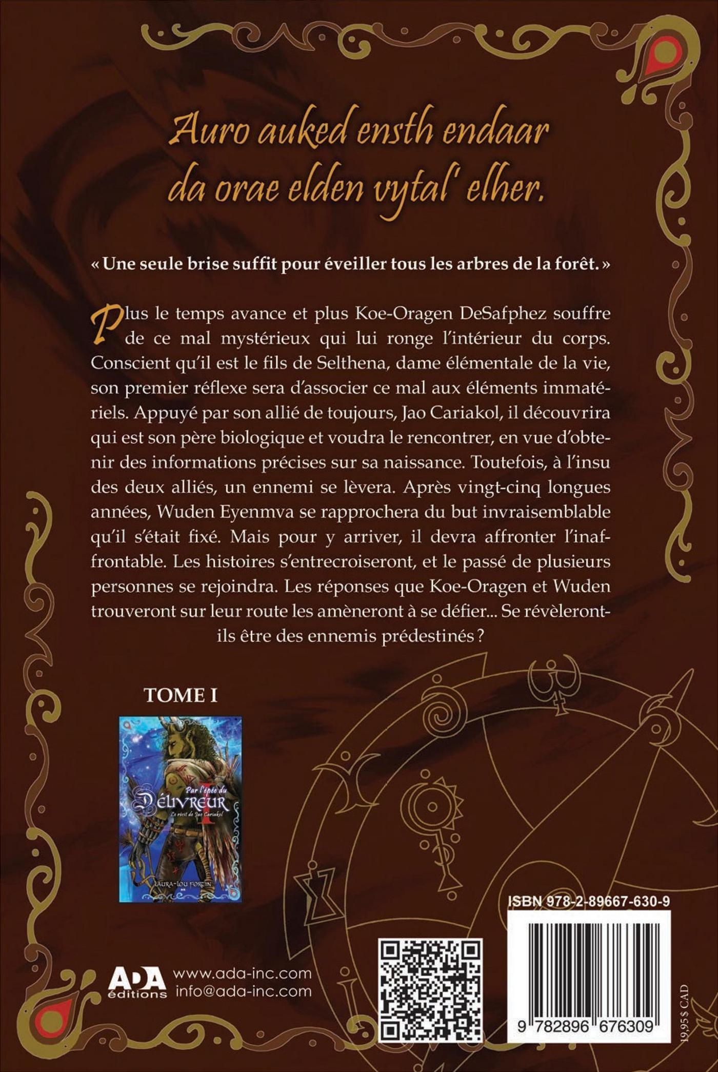 Plus le temps avance et plus Koe-Oragen DeSafphez souffre de ce mal mystérieux qui lui ronge l’intérieur du corps. Conscient qu’il est le fils de Selthena, dame élémentale de la vie, son premier réflexe sera d’associer ce mal aux éléments immatériels. Appuyé par son allié de toujours, Jao Cariakol, il découvrira qui est son père biologique et voudra le rencontrer, en vue d’obtenir des informations précises sur sa naissance. Toutefois, à l’insu des deux alliés, un ennemi se lèvera. Après vingt-cinq longues années, Wuden Eyenmva se rapprochera du but invraisemblable qu’il s’était fixé. Mais pour y arriver, il devra affronter l’inaffrontable. Les histoires s’entrecroiseront, et le passé de plusieurs personnes se rejoindra. Les réponses que Koe-Oragen et Wuden trouveront sur leur route les amèneront à se défier... Se révèleront-ils être des ennemis prédestinés?