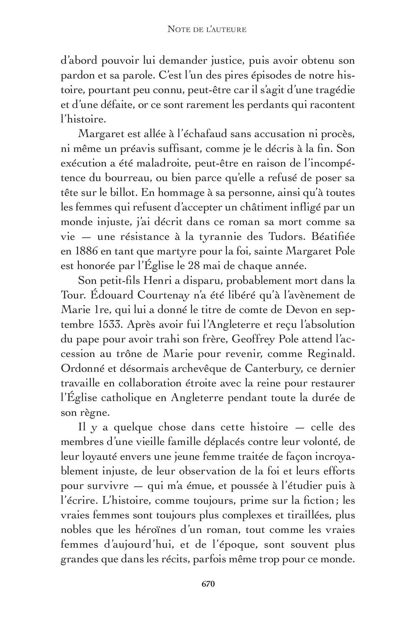 Le dernier roman de la série «Guerre des Deux- Roses», de la mini-série Starz acclamée par la critique, Philippa Gregory raconte l’histoire fascinante de Margaret Pole, cousine d’Elizabeth d’York, et dame de compagnie de Catherine d’Aragon.Considéré comme une menace au trône pour le volatile roi Henry VII, Margaret Pole, cousine d’Elizabeth d’York (connue sous le nom de la princesse Blanche) et la fille de George, duc deClarence, sera mariée à un partisan du roi de la maison Lancastre, Sir Richard Pole. Pour sa loyauté, Sir Richard est chargé de la gouvernance du pays de Galles, mais la vie rangée de Margaret est changée à jamais avec l’arrivée d’Arthur, le jeune prince de Galles, et de sa belle épouse, Catherine d’Aragon. Margaret devient vite une personne de confiance et amie des nouveaux mariés, cachant ses propres liens royaux au service des Tudors.Après la mort soudaine du Prince Arthur, Katherine maintenant veuve part pour Londres,et garde sa promesse faite lors du décès de son mari en se mariant avec son frère, HenryVIII. Le monde de Margaret est chamboulé par la convocation surprenante à la cour, où elle devient la première dame de compagnie de la reine Catherine. Mais cette vie idyllique ne durera que jusqu’à la montée d’Anne Boleyn, et la déchéance des Tudors. Margaret doit choisir son allégeance au roi tyran, ou à sa reine bien-aimée; l’amour de sa religion ou la théologie des nouveaux maîtres. Prise entre l’ancien et le nouveau monde, Margaret Pole doit trouver son propre chemin, tout en portant le fardeau d’une vieille malédiction qui afflige tous les Tudors.