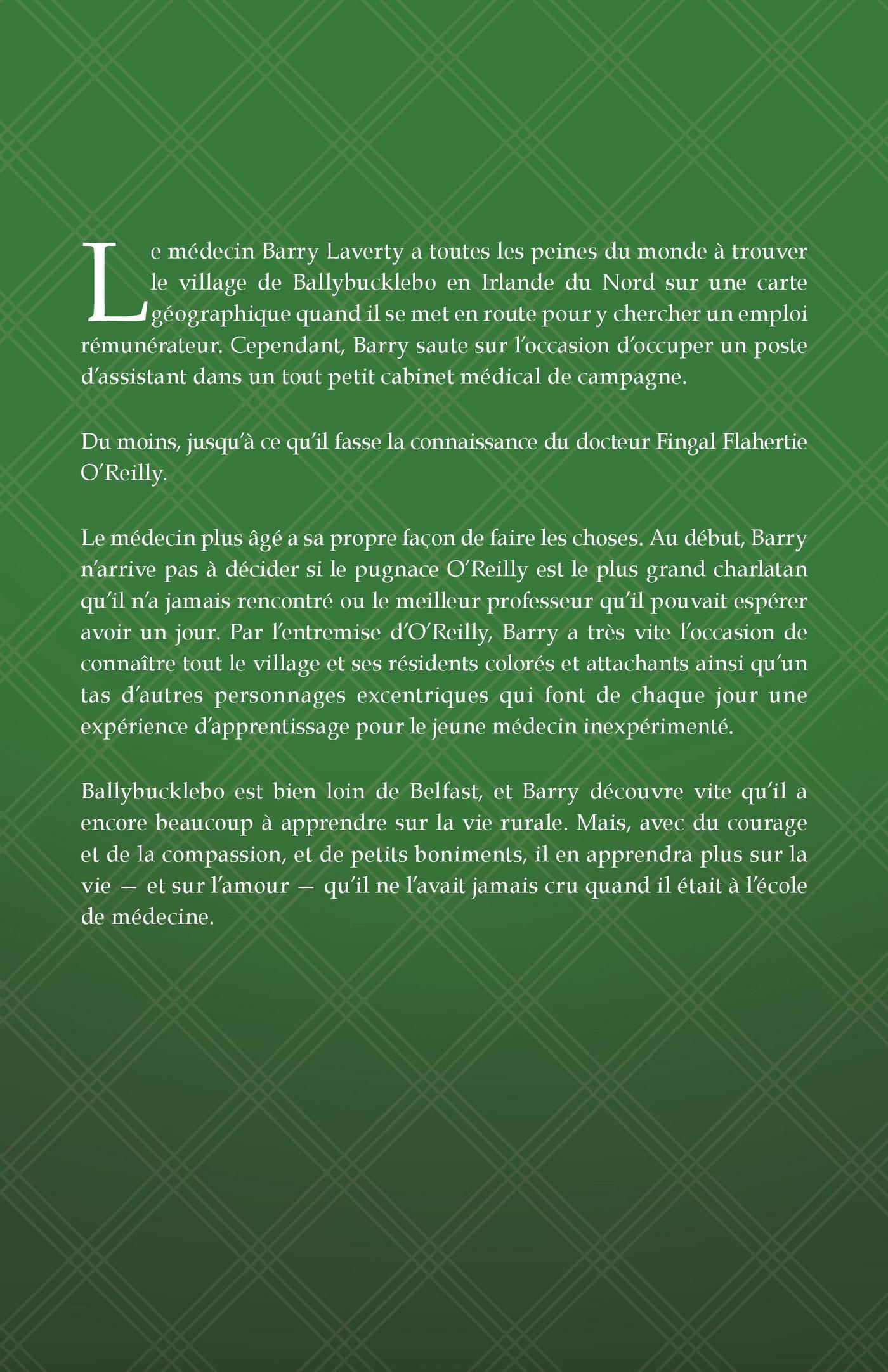 Un médecin de la campagne irlandaise est un récit charmant et captivant qui fascinera les lecteurs dès la première page — et les laissera avec l’envie de visiter la campagne irlandaise des jours passés…Barry Laverty, M. D., a toutes les peines du monde à trouver le village de Ballybucklebo en Irlande du Nord sur une carte géographique quand il se met en route pour y chercher un emploi rémunérateur. Cependant, Barry saute sur l’occasion d’occuper un poste d’assistant dans un tout petit cabinet médical de campagne.Du moins, jusqu’à ce qu’il fasse la connaissance du docteur Fingal Flahertie O’Reilly.Le médecin plus âgé a sa propre façon de faire les choses. Au début, Barry n’arrive pas à décider si le pugnace O’Reilly est le plus grand charlatan qu’il n’a jamais rencontré ou le meilleur professeur qu’il pouvait espérer avoir un jour. Par l’entremise d’O’Reilly, Barry a très vite l’occasion de connaître tout le village et ses résidents colorés et attachants ainsi qu’un tas d’autres personnages excentriques qui font de chaque jour une expérience d’apprentissage pour le jeune médecin inexpérimenté.Ballybucklebo est bien loin de Belfast et Barry découvre vite qu’il a encore beaucoup à apprendre sur la vie rurale. Mais avec du courage et de la compassion et seulement une petite pincée de blabla, il en apprendra plus sur la vie — et sur l’amour — qu’il ne l’avait jamais cru quand il était à l’école de médecine.