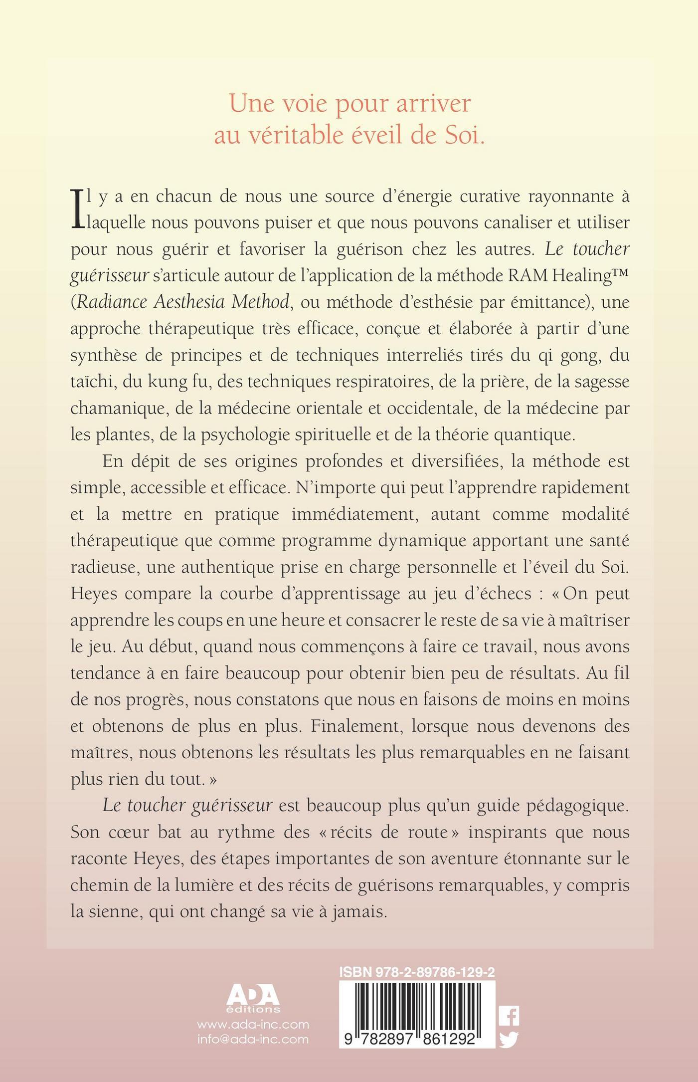Nous avons tous une source d’énergie curative rayonnante à laquelle nous pouvons puiser et que nous pouvons canaliser et utiliser pour nous guérir et favoriser la guérison chez les autres. Le toucher guérisseur s’articule autour de l’application de la méthode RAM Healing™ (Radiance Aesthesia Method ou méthode d’esthésie parémittance), une approche thérapeutique très efficace, conçue et élaborée à partir d’une synthèse de principes et de techniques intereliés tirés du Qi Gong, du taï-chi, du kung fu, des techniques respiratoires, de la prière, de la sagesse chamanique, de la médecine orientale et occidentale, de la médecine par les plantes, de la psychologie spirituelle et de la théorie quantique.En dépit de ses origines profondes et diversifiées, la méthode est simple, accessible et efficace. N’importe qui peut l’apprendre rapidement et la mettre en pratique immédiatement, autant comme modalité thérapeutique que comme programme dynamique apportant une santé radieuse, une authentique prise en charge personnelle et l’éveil du Soi. Heyes compare la courbe d’apprentissage au jeu d’échecs: «On peut apprendre les coups en une heure et consacrer le reste de sa vie à maîtriser le jeu. Quand nous commençons à faire ce travail au début, nous avons tendance à en faire beaucoup pour obtenir un minimum de résultats. Au fil de nos progrès, nous constatons que nous en faisons de moins en moins et obtenons de plus en plus. Finalement, lorsque nous devenons des maîtres, nous obtenons les résultats les plus remarquables en ne faisant plus rien du tout.»Le toucher guérisseur est beaucoup plus qu’un guide pédagogique. Son coeur bat au rythme des «récits de route» inspirants que nous raconte Heyes, des étapes importantes de son aventure étonnante sur le chemin de la lumière et des récits de guérisons remarquables, y compris la sienne, qui ont changé sa vie à jamais.