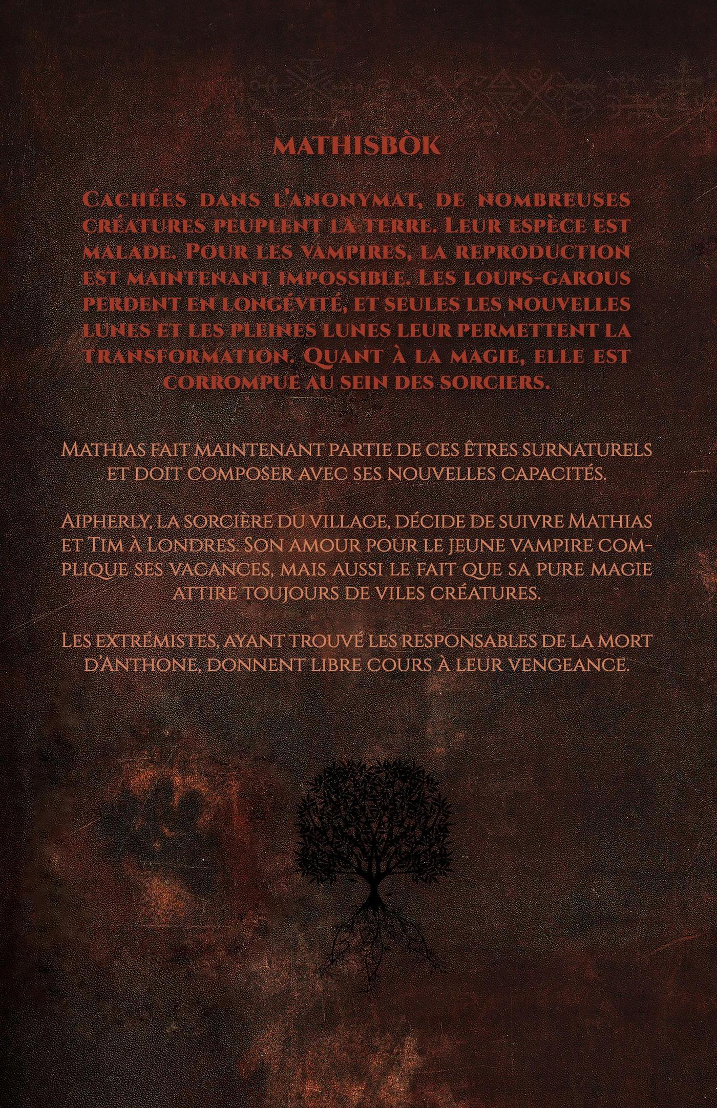 Cachées dans l’anonymat, de nombreuses créatures peuplent la terre. Leur espèceest malade. Pour les vampires, la reproduction est maintenant impossible. Lesloups-garous perdent en longévité, et seules les nouvelles lunes et les pleines lunes leur permettent la transformation. Quant à la magie, elle est corrompue au sein des sorciers.Mathias fait maintenant partie de ces êtres surnaturels et doit composer avec ses nouvelles capacités.Aipherly, la sorcière du village, décide de suivre Mathias et Tim à Londres. Son amourpour le jeune vampire complique ses vacances, mais aussi le fait que sa pure magie attire toujours de viles créatures. Les extrémistes, ayant trouvé les responsables de la mort d’Anthone donnent libre cours à leur vengeance.