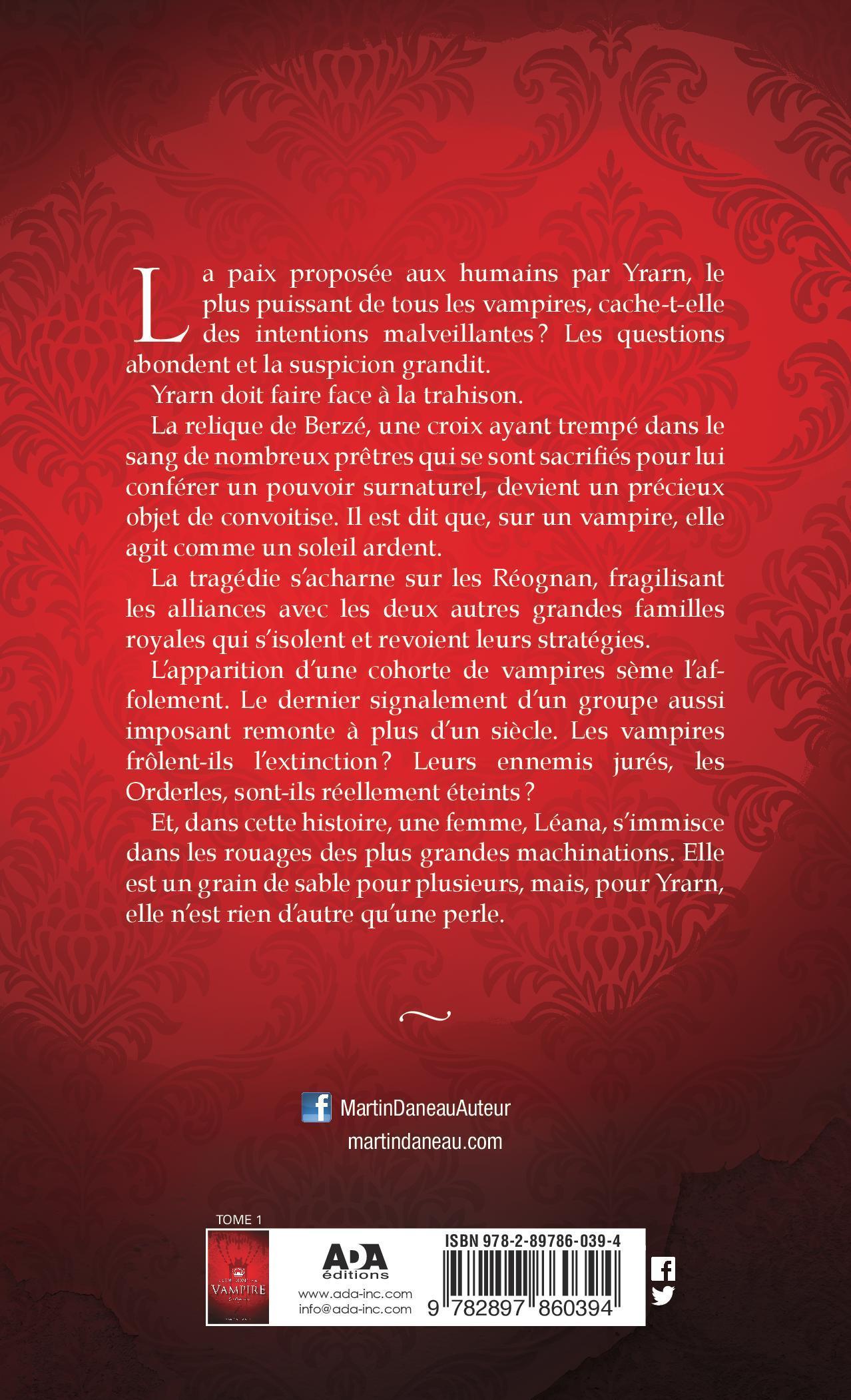 La paix proposée aux humains par Yrarn, le plus puissant de tous les vampires, cache-t-elle des intentions malveillantes ? Les questions abondent et la suspicion grandit.Yrarn doit faire face à la trahison.La relique de Berzé, une croix ayant trempé dans le sang de nombreux prêtres qui se sont sacrifiés pour lui conférer un pouvoir surnaturel, devient un précieux objet de convoitise. Il est dit que, sur un vampire, elle agit comme un soleil ardent.La tragédie s’acharne sur les Réognan, fragilisant les alliances avec les deux autres grandes familles royales qui s’isolent et revoient leurs stratégies.L’apparition d’une cohorte de vampires sème l’affolement. Le dernier signalement d’un groupe aussi imposant remonte à plus d’un siècle. Les vampires frôlent-ils l’extinction? Leurs ennemis jurés, les Orderles, sont-ils réellement éteints?Et, dans cette histoire, une femme, Léana, s’immisce dans les rouages des plus grandesmachinations. Elle est un grain de sable pour plusieurs, mais, pour Yrarn, elle n’est rien d’autre qu’une perle.