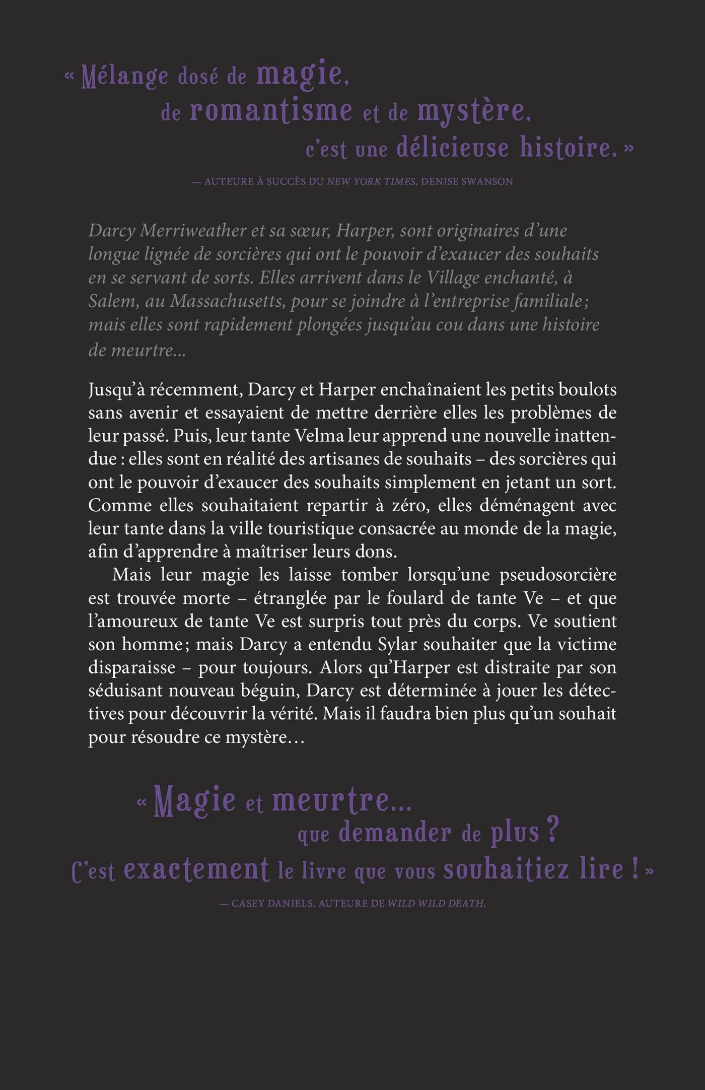 Darcy Merriweather et sa soeur, Harper, sont originaires d’une longue lignée de sorcières qui ont le pouvoir d’exaucer des souhaits en se servant de sorts. Elles arrivent dans le Village enchanté, à Salem, au Massachusetts, pour se joindre à l’entreprise familiale; mais elles sont rapidement plongées jusqu’au cou dans une histoire de meurtre...Jusqu’à récemment, Darcy et Harper enchaînaient les petits emplois sans avenir et essayaient de mettre les troubles de leur passé derrière elles. Puis leur tante Velma leur apprend une nouvelle explosive : elles sont en réalité des artisanes de souhaits — des sorcières qui ont le pouvoir d’exaucer des souhaits simplement en jetant un sort. Comme elles souhaitaient repartir à zéro, elles déménagent avec leur tante, dans la ville touristique consacrée au monde de la magie, afin d’apprendre à maîtriser leurs dons.Mais leur magie les laisse tomber lorsqu’une pseudosorcière est trouvée morte — étrangléepar le foulard de tante Ve — alors que l’amoureux de tante Ve est surpris tout près du corps. Ve soutient son homme; mais Darcy a entendu Sylar souhaiter que la victime disparaisse — pour toujours. Alors qu’Harper est distraite par son séduisant nouvel amour, Darcy est déterminée à jouer les détectives pour découvrir la vérité. Mais il faudra bien plus qu’un souhait pour résoudre ce mystère…