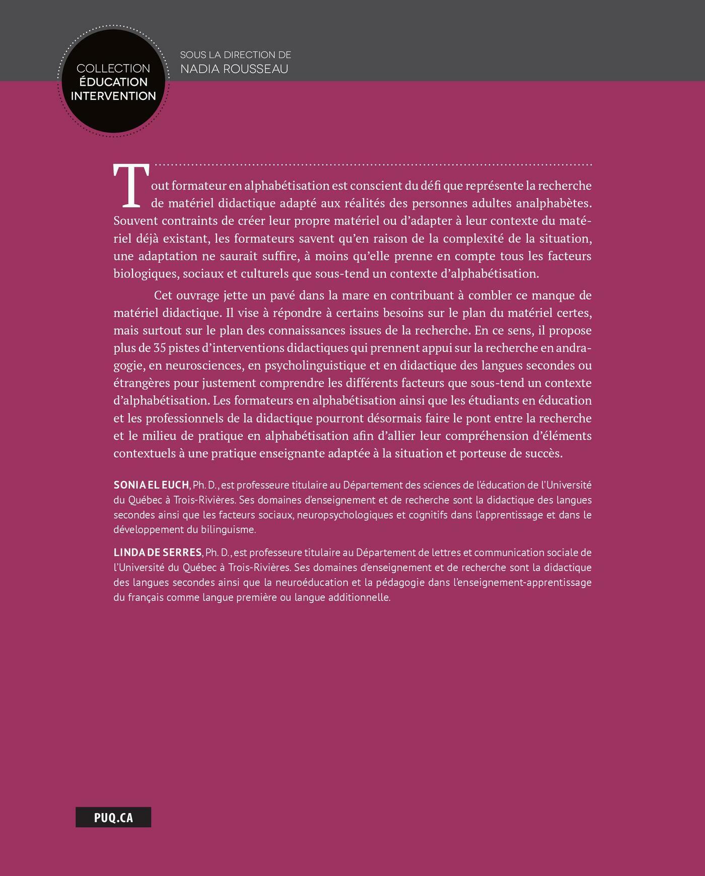 Tout formateur en alphabétisation est conscient du défi que représente la recherche de matériel didactique adapté aux réalités des personnes adultes analphabètes. Souvent contraints de créer leur propre matériel ou d’adapter à leur contexte du matériel déjà existant, les formateurs savent qu’en raison de la complexité de la situation, une adaptation ne saurait suffire, à moins qu’elle prenne en compte tous les facteurs biologiques, sociaux et culturels que sous-tend un contexte d’alphabétisation.Cet ouvrage jette un pavé dans la mare en contribuant à combler ce manque de matériel didactique. Il vise à répondre à certains besoins sur le plan du matériel certes, mais surtout sur le plan des connaissances issues de la recherche. En ce sens, il propose plus de 35 pistes d’interventions didactiques qui prennent appui sur la recherche en andragogie, en neurosciences, en psycholinguistique et en didactique des langues secondes ou étrangères pour justement comprendre les différents facteurs que sous-tend un contexte d’alphabétisation. Les formateurs en alphabétisation ainsi que les étudiants en éducation et les professionnels de la didactique pourront désormais faire le pont entre la recherche et le milieu de pratique en alphabétisation afin d’allier leur compréhension d’éléments contextuels à une pratique enseignante adaptée à la situation et porteuse de succès.Sonia El Euch est professeure titulaire au Département des sciences de l’éducation de l’Université du Québec à Trois-Rivières (UQTR). Ses domaines d’enseignement et de recherche sont la didactique des langues secondes ainsi que les facteurs sociaux, psychologiques et cognitifs dans l’apprentissage et dans le développement du bilinguisme.LINDA DE SERRES, Ph. D., est professeure titulaire au Département de lettres et communication sociale de l’Université du Québec à Trois-Rivières. Ses domaines d’enseignement et de recherche sont la didactique des langues secondes ainsi que la neuroéducation et la pédagogie dans l’enseignement-apprentissage du français comme langue première ou langue additionnelle.