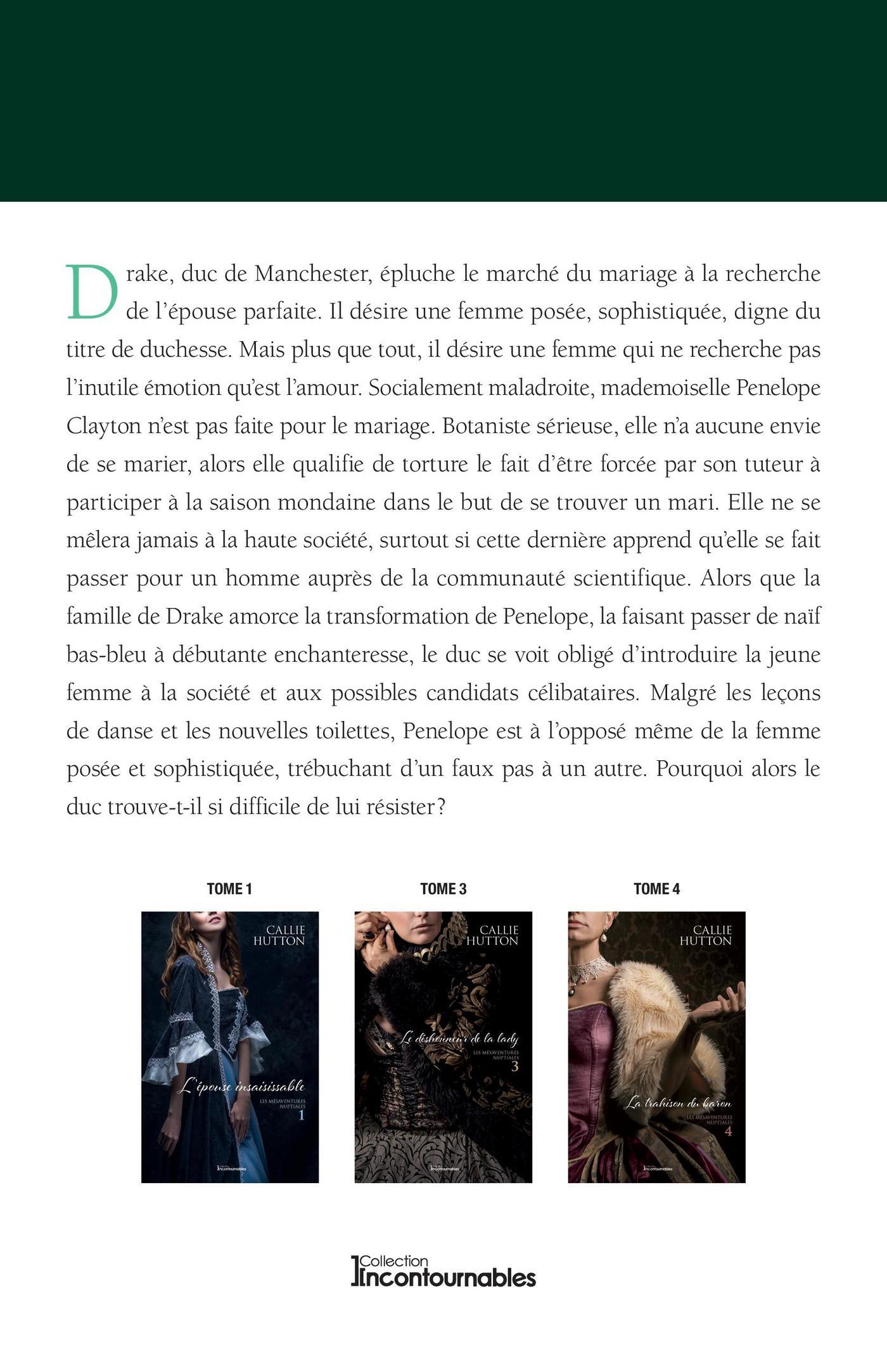 Drake, duc de Manchester, épluche le marché du mariage à la recherche de l’épouse parfaite. Il désire une femme posée, sophistiquée, digne du titre de duchesse. Mais plus que tout, il désire une femme qui ne recherche pas l’inutile émotion qu’est l’amour. Socialement maladroite, mademoiselle Penelope Clayton n’est pas faite pour le mariage. Botaniste sérieuse, elle n’a aucune envie de se marier, alors elle qualifie de torture le fait d’être forcée par son tuteur à participer à la saison mondaine dans le but de se trouver un mari. Elle ne se mêlera jamais à la haute société, surtout si cette dernière apprend qu’elle se fait passer pour un homme auprès de la communauté scientifique. Alors que la famille de Drake amorce la transformation de Penelope, la faisant passer de naïf bas-bleu à débutante enchanteresse, le duc se voit obligé d’introduire la jeune femme à la société et aux possibles candidats célibataires. Malgré les leçons de danse et les nouvelles toilettes, Penelope est à l’opposé même de la femme posée et sophistiquée, trébuchant d’un faux pas à un autre. Pourquoi alors le duc trouve-t-il si difficile de lui résister?