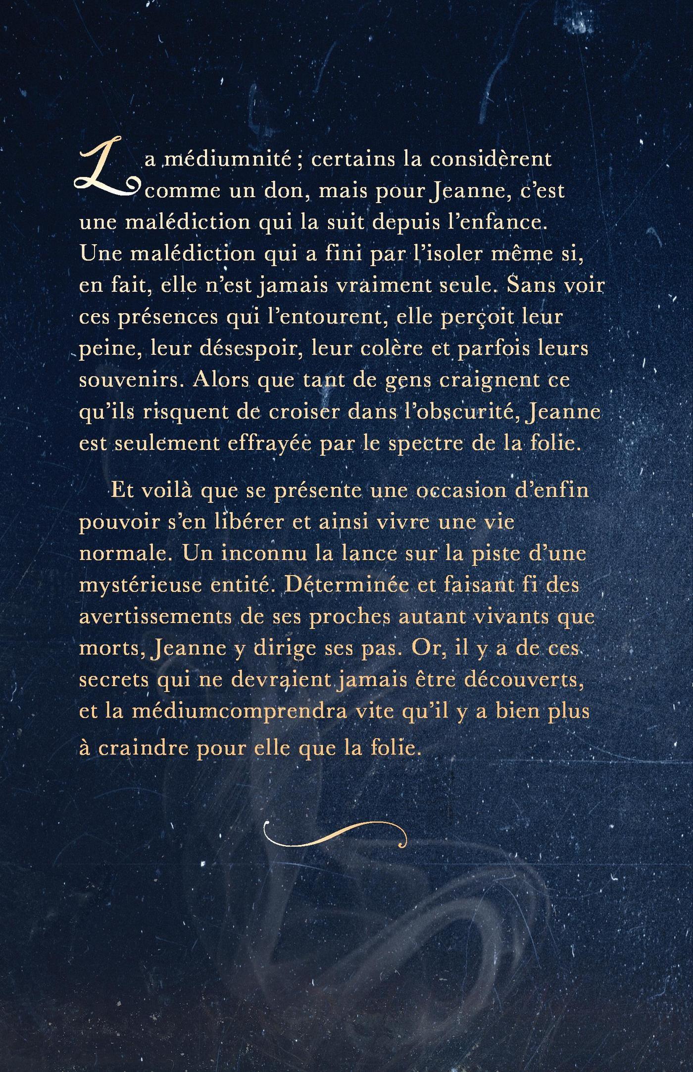 La médiumnité; certains la considèrent comme un don, mais pour Jeanne, c’est une malédiction qui la suit depuis l’enfance. Une malédiction qui a fini par l’isoler même si, en fait, elle n’est jamais vraiment seule. Sans voir ces présences qui l’entourent, elle perçoit leur peine, leur désespoir, leur colère et parfois leurs souvenirs. Alors que tant de gens craignent ce qu’ils risquent de croiser dans l’obscurité, Jeanne est seulement effrayée par le spectre de la folie.Et voilà que se présente une occasion d’enfin pouvoir s’en libérer et ainsi vivre une vie normale. Un inconnu la lance sur la piste d’une mystérieuse entité. Déterminée et faisant fi des avertissements de ses proches autant vivants que morts, Jeanne y dirige ses pas. Or, il y a de ces secrets qui ne devraient jamais être découverts, et la médium comprendra vite qu’il y a bien plus à craindre pour elle que la folie.