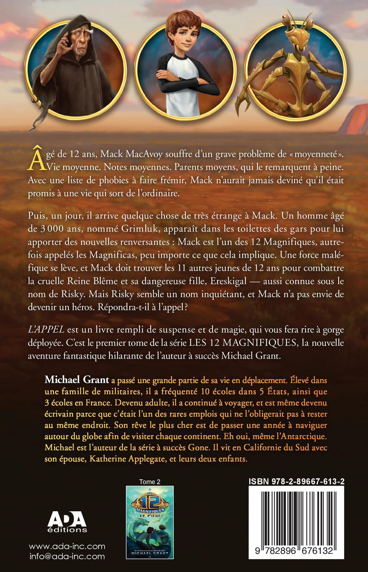 Âgé de 12 ans, Mack MacAvoy souffre d’un grave problème de «moyenneté». Vie moyenne. Notes moyennes. Parents moyens, qui le remarquent à peine. Avec une liste de phobies à faire frémir, Mack n’aurait jamais deviné qu’il était promis à une vie qui sort de l’ordinaire. Puis, un jour, il arrive quelque chose de très étrange à Mack. Un homme âgé de 3 000 ans, nommé Grimluk, apparaît dans les toilettes des gars pour lui apporter des nouvelles renversantes: Mack est l’un des 12 Magnifiques, autrefois appelés les Magnificas, peu importe ce que cela implique. Une force maléfique se lève, et Mack doit trouver les 11 autres jeunes de 12 ans pour combattre la cruelle Reine Blême et sa dangereuse fille, Ereskigal — aussi connue sous le nom de Risky. Mais Risky semble un nom inquiétant, et Mack n’a pas envie de devenir un héros. Répondra-t-il à l’appel? L’APPEL est un livre rempli de suspense et de magie, qui vous fera rire à gorge déployée. C’est le premier tome de la série LES 12 MAGNIFIQUES, la nouvelle aventure fantastique hilarante de l’auteur à succès Michael Grant.