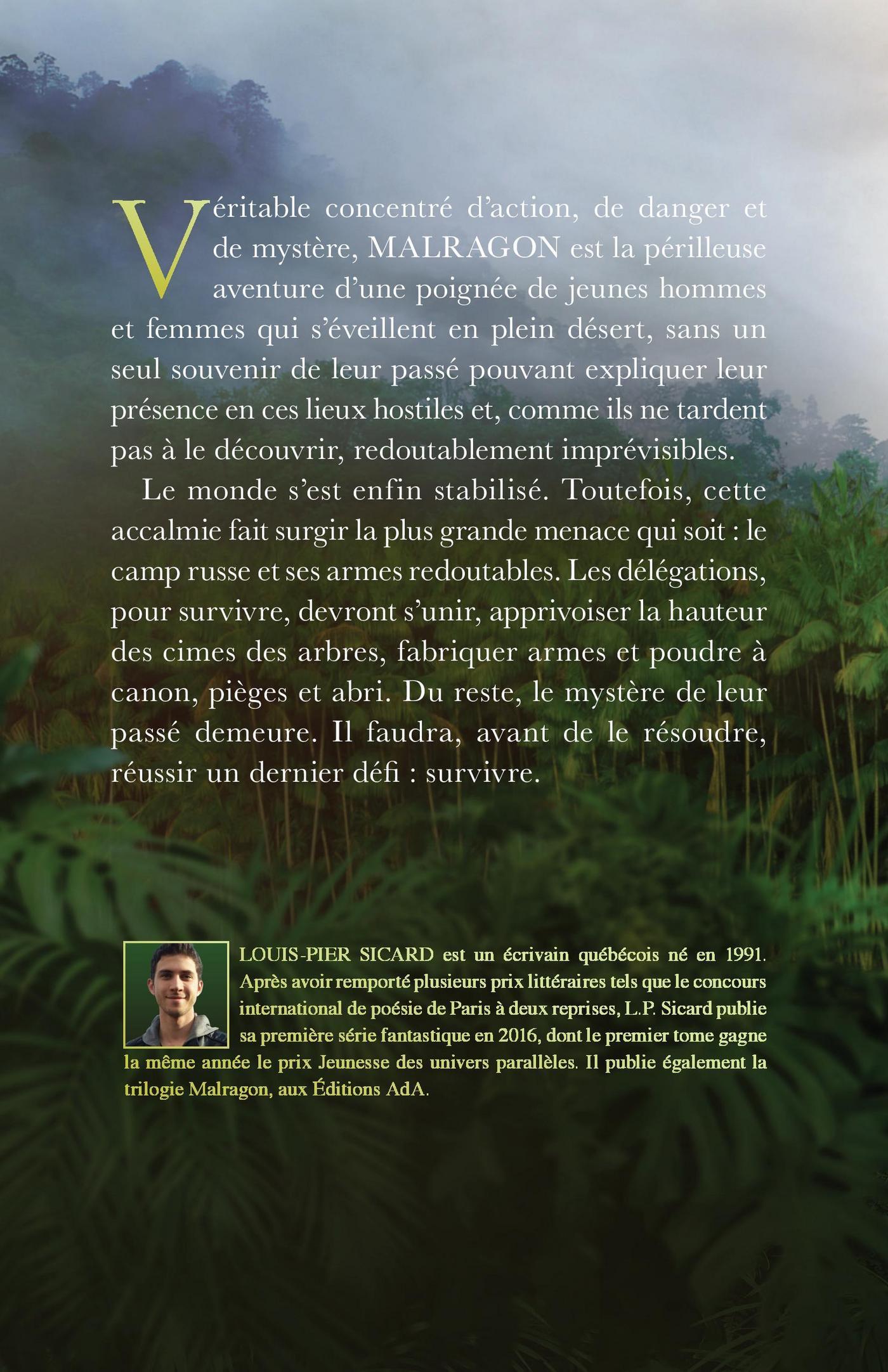 Véritable concentré d’action, de danger et de mystère, MALRAGON est la périlleuse histoire d’une poignée de jeunes hommes et femmes qui s’éveillent en plein désert, sans un seul souvenir de leur passé pouvant expliquer leur présence en ces lieux hostiles et, comme ils ne tardent pas à le découvrir, redoutablement imprévisibles. Le monde s’est enfin stabilisé. Toutefois, cette accalmie fait rejaillir la plus grande menace qui soit: le camp russe et ses armes redoutables. Les délégations, pour survivre, devront s’unir, apprivoiser les hauteurs des cimes des arbres, fabriquer armes et poudre à canon, pièges et abri. Du reste, le mystère de leur passé demeure; il faudra, avant de le résoudre, réussir un dernier défi: survivre.