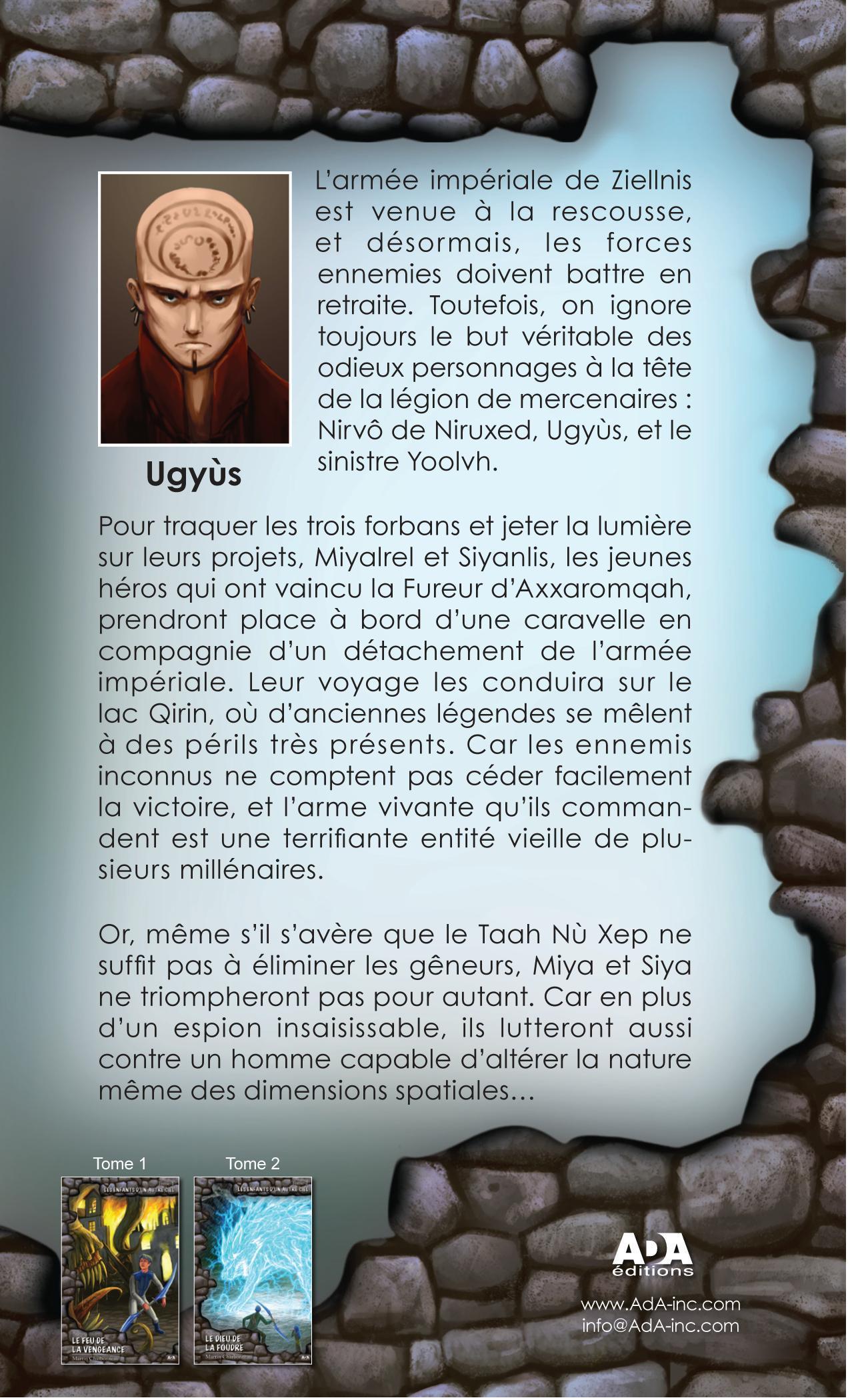 L’armée impériale de Ziellnis est venue à la rescousse, et désormais, les forces ennemies doivent battre en retraite. Toutefois, on ignore toujours le but véritable des odieux personnages à la tête de la légion de mercenaires: Nirvô de Niruxed, Ugyùs, et le sinistre Yoolvh. Pour traquer les trois forbans et jeter la lumière sur leurs projets, Miyalrel et Siyanlis, les jeunes héros qui ont vaincu la Fureur d’Axxaromqah, prendront place à bord d’une caravelle en compagnie d’un détachement de l’armée impériale. Leur voyage les conduira sur le lac Qirin, où d’anciennes légendes se mêlent à des périls très présents. Car les ennemis inconnus ne comptent pas céder facilementla victoire, et l’arme vivante qu’ils comman-dent est une terrifiante entité vieille de plusieurs millénaires. Or, même s’il s’avère que le Taah Nù Xep ne suffit pas à éliminer les gêneurs, Miya et Siya ne triompheront pas pour autant. Car en plus d’un espion insaisissable, ils lutteront aussi contre un homme capable d’altérer la nature même des dimensions spatiales…