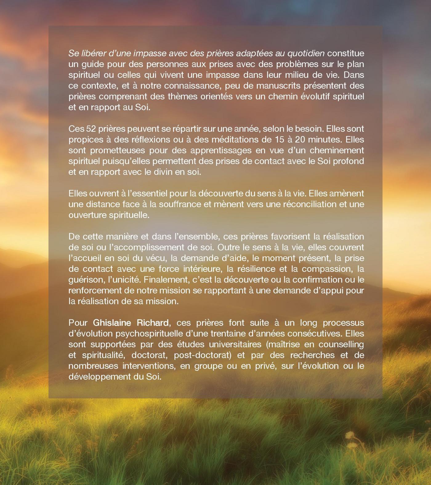 Se libérer d’une impasse avec des prières adaptées au quotidien constitue un guide pour des personnes aux prises avec des problèmes sur le plan spirituel, ou celles qui vivent une impasse dans leur milieu de vie. Dans ce contexte, et à notre connaissance, peu de manuscrits présentent des prières comprenant des thèmes orientés vers un chemin évolutif spirituel et en rapport au Soi.Ces 52 prières peuvent se répartir sur une année selon le besoin et elles sont propices à des réflexions ou à des méditations de 15-20 minutes. Ces prières sont prometteuses pour des apprentissages en vue d’un cheminement spirituel, puisqu’elles permettent des prises de contact avec le Soi profond et en rapport au divin en soi.Elles ouvrent à l’essentiel pour la découverte du sens à la vie et elles amènent une distance face à la souffrance, vers une réconciliation et une ouverture spirituelle.Dans cette manière et dans l’ensemble, des prières favorisent la réalisation de soi ou l’accomplissement de soi. Outre le sens à la vie, elles couvrent l’accueil en soi du vécu, la demande d’aide, le moment présent, laprise de contact avec une force intérieure, la résilience et compassion, la guérison, l’unicité. Finalement, c’est la découverte, ou la confirmation, ou le renforcement de notre mission, se rapportant à une demande d’appui pour la réalisation de sa mission.Pour Ghislaine Richard, des prières font suite à un long processus d’évolution psychospirituelle d’une trentaine d’annéesconsécutives. Elles sont supportées par des études universitaires (maîtrise en counselling et spiritualité, doctorat, post-doctorat), et par des recherches et de nombreuses interventions en groupe ou en privé, sur l’évolution ou le développement du Soi.
