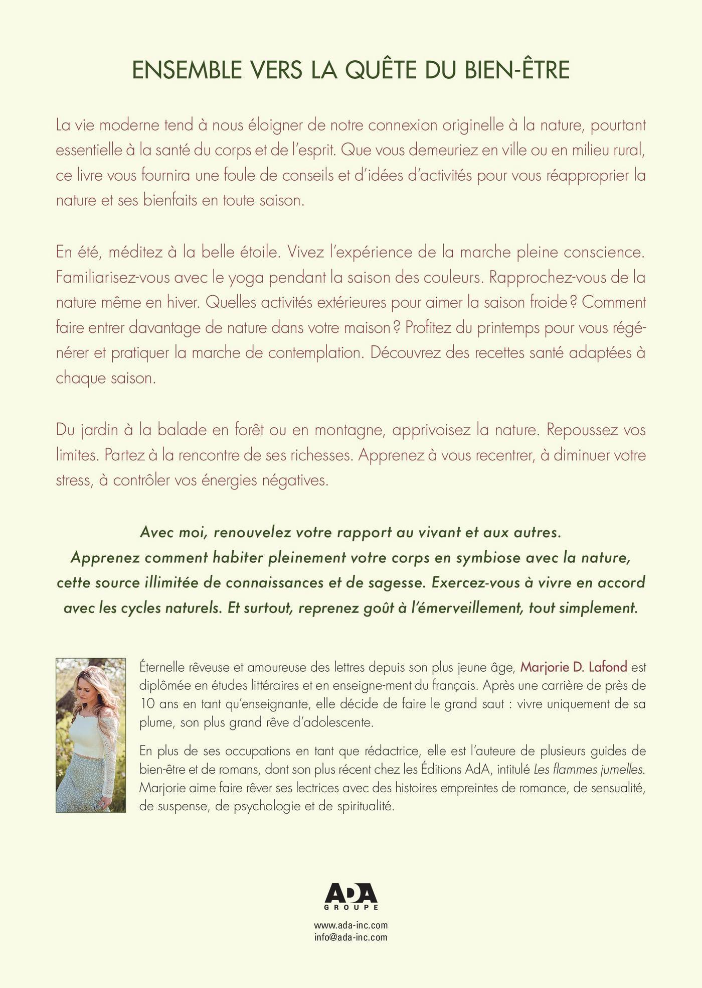 Ensemble vers la quête du bien-être La vie moderne tend à nous éloigner de notre connexion originelle à la nature, pourtant essentielle à la santé du corps et de l’esprit. Que vous demeuriez en ville ou en milieu rural, ce livre vous fournira une foule de conseils et d’idées d’activités pour vous réapproprier la nature et ses bienfaits en toute saison. En été, méditez à la belle étoile. Vivez l’expérience de la marche pleine conscience. Familiarisez-vous avec le yoga pendant la saison des couleurs. Rapprochez-vous de la nature même en hiver. Quelles activités extérieures pour aimer la saison froide? Comment faire entrer davantage de nature dans votre maison ? Profitez du printemps pour vous régénérer et pratiquer la marche de contemplation. Découvrez des recettes santé adaptées à chaque saison.Du jardin à la balade en forêt ou en montagne, apprivoisez la nature. Repoussez vos limites. Partez à la rencontre de ses richesses. Apprenez à vous recentrer, à diminuer votre stress, à contrôler vos énergies négatives. Avec moi, renouvelez votre rapport au vivant et aux autres. Apprenez comment habiter pleinement votre corps en symbiose avec la nature, cette source illimitée de connaissances et de sagesse. Exercez-vous à vivre en accord avec les cycles naturels. Et surtout, reprenez goût à l’émerveillement, tout simplement.