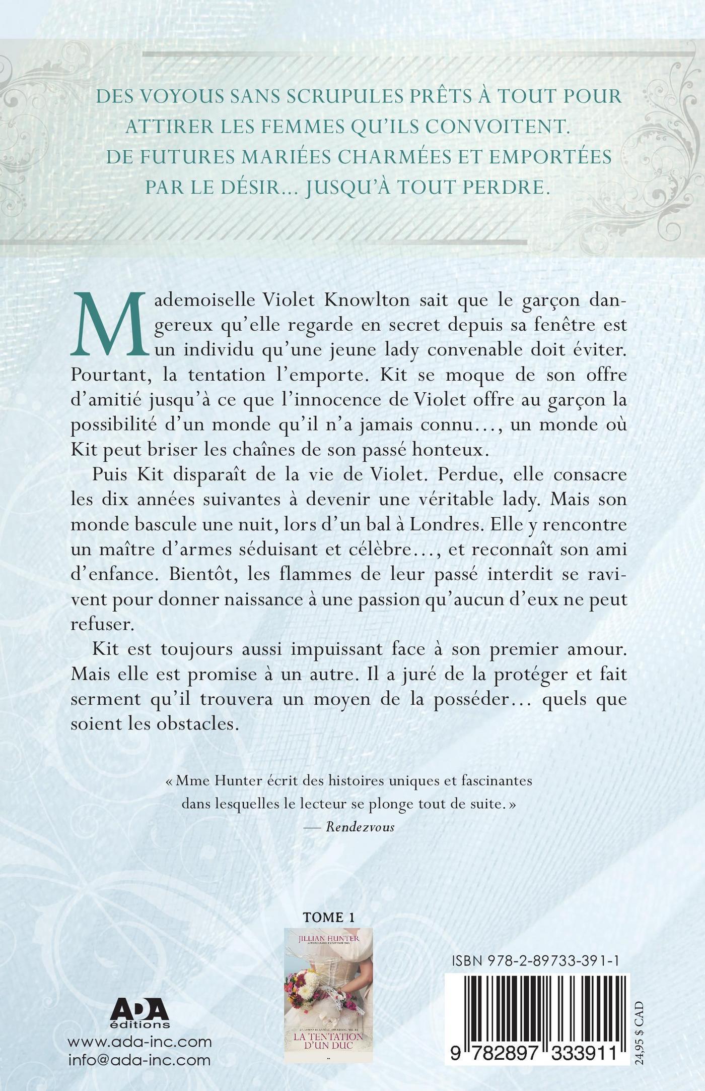 Mademoiselle Violet Knowlton sait que le garçon dangereux qu’elle regarde en secret depuis sa fenêtre est un individu qu’une jeune lady convenable doit éviter. Pourtant, la tentation l’emporte. Kit se moque de son offre d’amitié jusqu’à ce que l’innocence de Violet offre au garçon la possibilité d’un monde qu’il n’a jamais connu…, un monde où Kit peut briser les chaînes de son passé honteux. Puis Kit disparaît de la vie de Violet. Perdue, elle consacre les dix années suivantes à devenir une véritable lady. Mais son monde bascule une nuit, lors d’un bal à Londres. Elle y rencontre un maître d’armes séduisant et célèbre…, et reconnaît son ami d’enfance. Bientôt, les flammes de leur passé interdit se ravivent pour donner naissance à une passion qu’aucun d’eux ne peut refuser. Kit est toujours aussi impuissant face à son premier amour. Mais elle est promise à un autre. Il a juré de la protéger et fait serment qu’il trouvera un moyen de la posséder… quels que soient les obstacles.