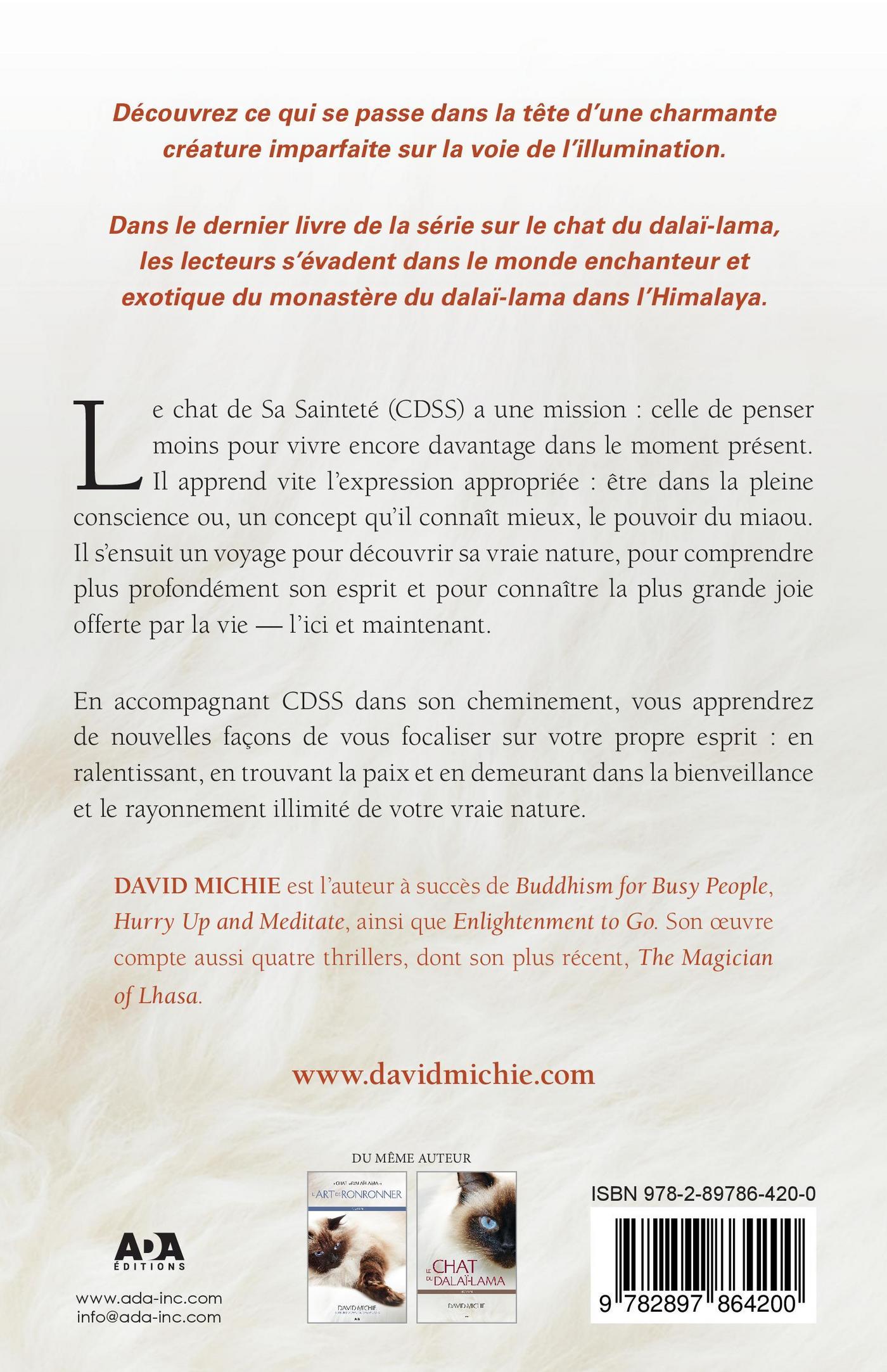 Dans le dernier livre de la série sur le chat du dalaï-lama, les lecteurs s’évadent dans le monde enchanteur et exotique du monastère du dalaï-lama dans l’Himalaya.Le chat de Sa Sainteté (CDSS) a une mission : celle de penser moins pour vivre encore davantage dans le moment présent. Il apprend vite l’expression appropriée: être dans la pleine conscience ou, un concept qu’il connaît mieux, le pouvoir du miaulement. Il s’ensuit un voyage pour découvrir sa vraie nature, pour comprendre plus profondément son esprit et pour connaître la plus grande joie offerte par la vie — l’ici et maintenant.En accompagnant CDSS dans son cheminement, vous apprendrez des nouvelles façons de vous focaliser sur votre propre esprit: en ralentissant, en trouvant la paix et en demeurant dans la bienveillance et le rayonnement illimité de votre vraie nature.