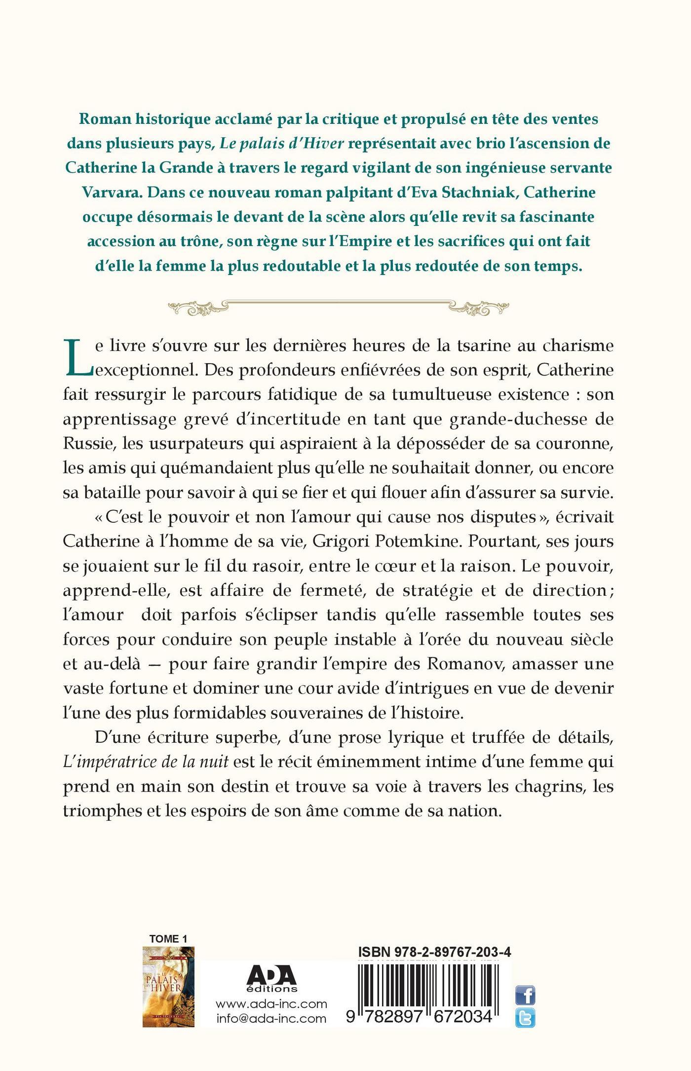 Roman historique acclamé par la critique et propulsé en tête des ventes dans plusieurs pays, Le palais d’Hiver représentait avec brio l’ascension de Catherine la Grande à travers le regard vigilant de son ingénieuse servante Varvara. Dans ce nouveau roman palpitant d’Eva Stachniak, Catherine occupe désormais le devant de la scène alors qu’elle revit sa fascinante accession au trône, son règne sur l’Empire et les sacrifces qui ont fait d’elle la femme la plus redoutable et le plus redoutée de son temps.Le livre s’ouvre sur les dernières heures de la tsarine au charisme exceptionnel. Des profondeurs enfévrées de son esprit, Catherine fait ressurgir le parcours fatidique de sa tumultueuse existence: son apprentissage grevé d’incertitude en tant que grande-duchesse de Russie, les usurpateurs qui aspiraient à la déposséder de sa couronne, les amis qui quémandaient plus qu’elle ne souhaitait donner ou encore sa bataille pour savoir à qui se fer et qui fouer afn d’assurer sa survie.«C’est le pouvoir et non l’amour qui cause nos disputes», écrivait Catherine à l’homme de sa vie, Grigori Potemkine. Pourtant ses jours se jouaient sur le fl du rasoir, entre le cœur et la raison. Le pouvoir, apprend-elle, est affaire de fermeté, de stratégie et de direction; l’amour doit parfois s’éclipser tandis qu’elle rassemble toutes ses forces pour conduire son peuple instable à l’orée du nouveau siècle et au-delà – pour faire grandir l’empire des Romanov, amasser une vaste fortune et dominer une cour avide d’intrigues en vue de devenir l’une des plus formidables souveraines de l’histoire.D’une écriture superbe, d’une prose lyrique et truffée de détails, L’impératrice de la nuit est le récit éminemment intime d’une femme qui prend en main son destin et trouve sa voie à travers les chagrins, les triomphes et les espoirs de son âme comme de sa nation.