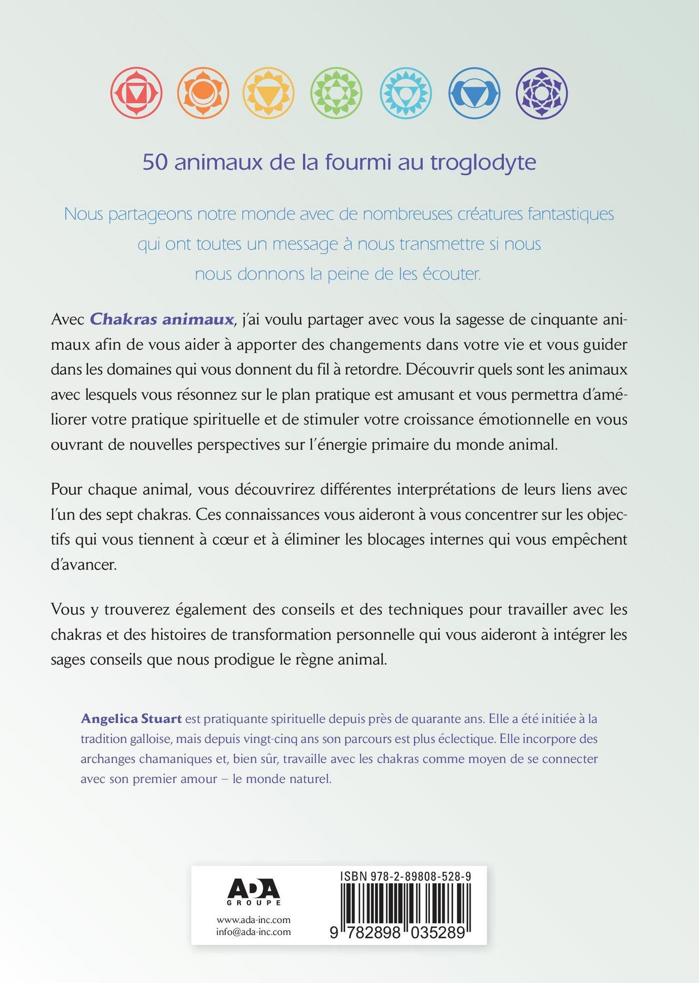 50 animaux de la fourmi au troglodyte Nous partageons notre monde avec de nombreuses créatures fantastiques qui ont toutes un message à nous transmettre si nous nous donnons la peine de les écouter. Avec Chakras animaux, j’ai voulu partager avec vous la sagesse de cinquante animaux afin de vous aider à apporter des changements dans votre vie et vous guider dans les domaines qui vous donnent du fil à retordre. Découvrir quels sont les animaux avec lesquels vous résonnez sur le plan pratique est amusant et vous permettra d’améliorer votre pratique spirituelle et de stimuler votre croissance émotionnelle en vous ouvrant de nouvelles perspectives sur l’énergie primaire du monde animal. Pour chaque animal, vous découvrirez différentes interprétations de leurs liens avec l’un des sept chakras. Ces connaissances vous aideront à vous concentrer sur les objectifs qui vous tiennent à cœur et à éliminer les blocages internes qui vous empêchent d’avancer. Vous y trouverez également des conseils et des techniques pour travailler avec les chakras et des histoires de transformation personnelle qui vous aideront à intégrer les sages conseils que nous prodigue le règne animal.