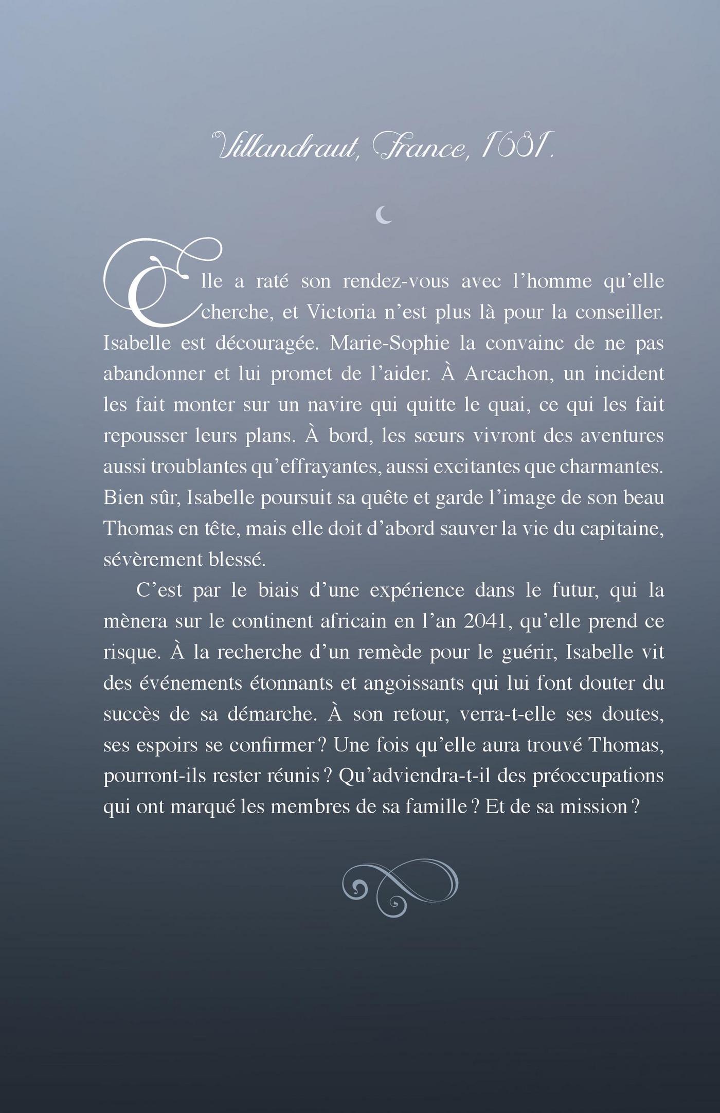 Elle a raté son rendez-vous avec l’homme qu’elle cherche et Victoria n’est plus là pour la conseiller. Isabelle est découragée. Marie-Sophie la convainc de ne pas abandonner et lui promet de l’aider. À Arcachon, un incident les fait monter sur un navire qui quitte le quai, ce qui les fait repousser leurs plans. À bord, les soeurs vivront des aventures aussi troublantes qu’effrayantes, aussi excitantes que charmantes. Bien sûr, Isabelle poursuit sa quête et garde l’image de son beau Thomas en tête, mais elle doit d’abord sauver la vie du capitaine.C’est par le biais d’une expérience dans le futur, qui la mènera sur le continent africain en l’an 2041, qu’elle prend ce risque. À la recherche d’un remède pour le guérir, Isabelle vit des évènements étonnants et angoissants qui lui font douter du succès de la démarche. À son retour, verra-t-elle ses doutes se confirmer? Une fois qu’elle aura trouvé Thomas, pourront-ils rester réunis? Qu’adviendra-t-il du reste de sa famille? Et de sa mission?