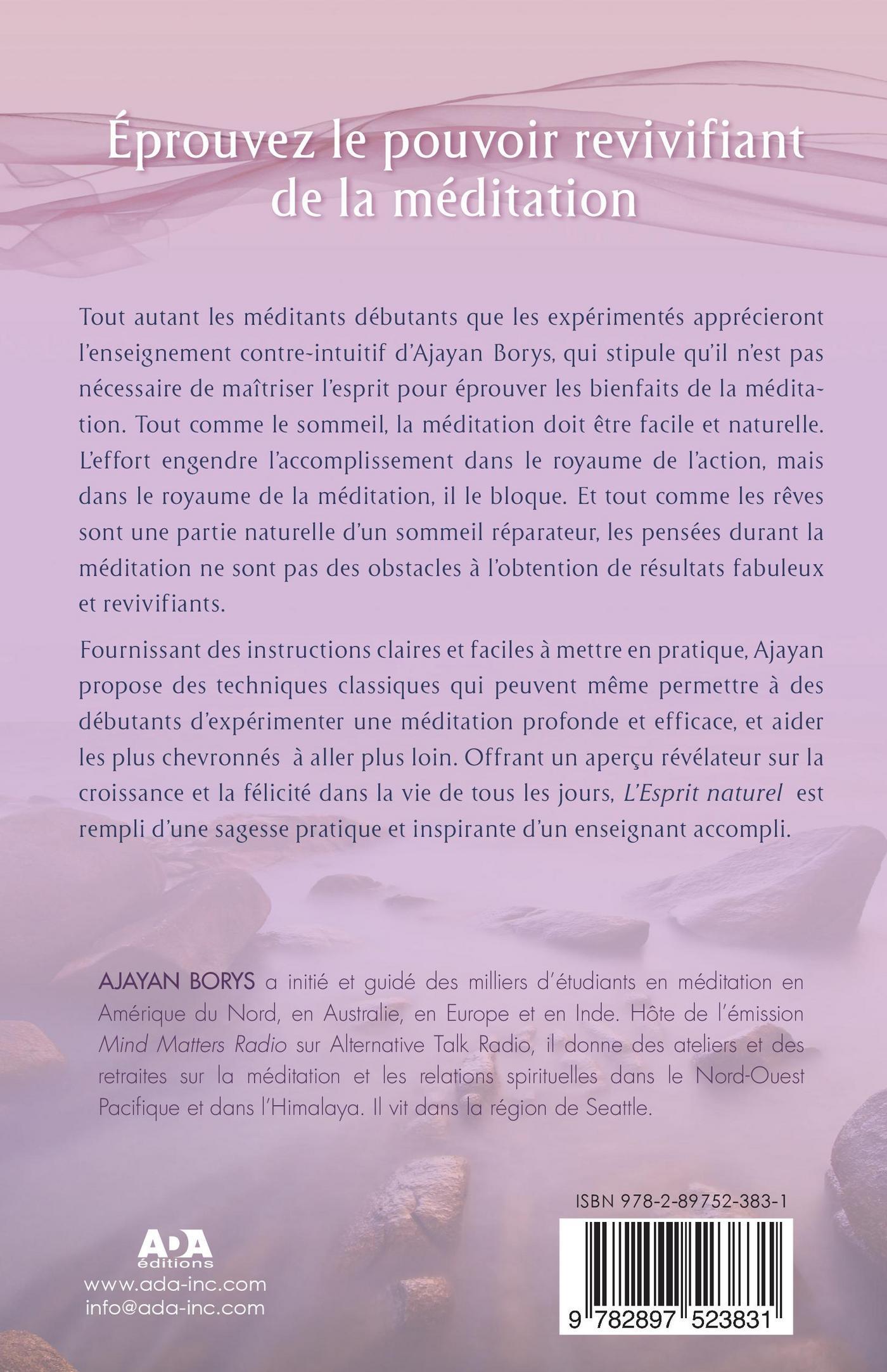 Les méditants débutants et expérimentés apprécieront aussi l’enseignement contre-intuitif d’Ajayan Borys, qui stipule qu’il n’est pas nécessaire de maîtriser son esprit pour éprouver les bienfaits de la méditation. Tout comme le sommeil, la méditation doit être facile et naturelle. L’effort engendre l’accomplissement dans le royaume de l’action, mais dans le royaume de la méditation, il le bloque. Et tout comme les rêves sont une partie naturelle d’un sommeil réparateur, les pensées durant la méditation ne sont pas des obstacles à l’obtention de résultats fabuleux et revivifiants. Fournissant des instructions claires et faciles à mettre en pratique, Ajayan propose des techniques classiques qui peuvent même permettre à des débutants d’expérimenter une méditation profonde, efficace, et aider les plus chevronnés à aller plus loin. Offrant un aperçu révélateur sur la croissance et la félicité dans la vie de tous les jours, L’Esprit naturel est rempli de la sagesse pratique et inspirante d’un enseignant accompli.