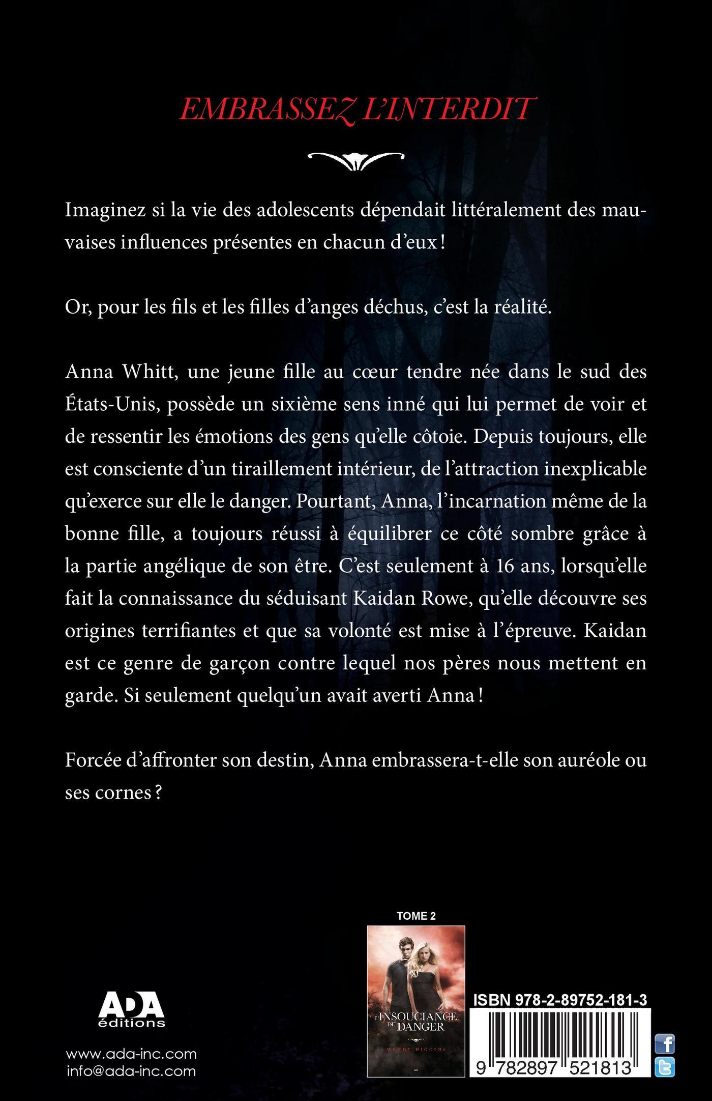 Imaginez si la vie des adolescents dépendait littéralement des mauvaises influences présentes en chacun d’eux! Or, pour les fils et les filles d’anges déchus, c’est la réalité.Anna Whitt, une jeune fille au coeur tendre, née dans le sud des États-Unis, possède un sixième sens inné qui lui permet de voir et de ressentir les émotions des gens qu’elle côtoie. Depuis toujours, elle est consciente d’un tiraillement intérieur, de l’attraction inexplicable qu’exerce sur elle le danger. Pourtant,Anna, l’incarnation même de la bonne fille, a toujours réussi à équilibrer sa zone d’ombre grâce à la partie angélique de son être. C’est seulement à seize ans, lorsqu’elle fait la connaissance du séduisant Kaidan Rowe, qu’elle découvre ses origines terrifiantes et que sa volonté est mise à l’épreuve. Kaidan, c’est ce genre de garçon contre lequel nos pères nous mettent en garde. Si seulement quelqu’un avait averti Anna! Confrontée à son destin, Anna embrassera-t-elle son auréole ou ses cornes?