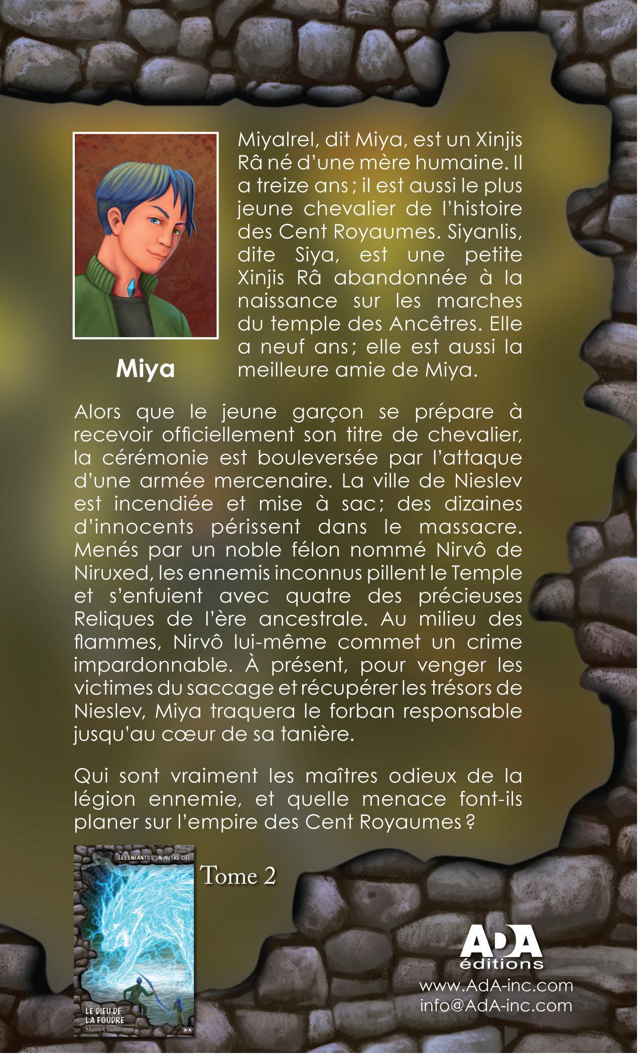 Miyalrel, dit Miya, est un Xinjis Râ, né d’une mère humaine. Il a treize ans; il estaussi le plus jeune chevalier de l’histoire des Cent Royaumes. Siyanlis, dite Siya,est une petite Xinjis Râ, abandonnée à la naissance sur les marches du temple desAncêtres. Elle a neuf ans; elle est aussi la meilleure amie de Miya. Alors que le jeune garçon se prépare à recevoir officiellement son titre de chevalier, la cérémonie est bouleversée par l’attaque d’une armée mercenaire. La ville de Nieslev est incendiée et mise à sac; des dizaines d’innocents périssent dans le massacre. Menés par un noble félon nommé Nirvô de Niruxed, les ennemis inconnus pillent le Temple et s’enfuient avec quatre des précieuses Reliques de l’ère ancestrale. Au milieu des flammes, Nirvô lui-même commet un crime impardonnable. À présent, pour venger les victimes du saccage et récupérer les trésors de Nieslev, Miya traquera le forban responsable jusqu’au coeur de sa tanière.Qui sont vraiment les maîtres odieux de la légion ennemie, et quelle menace fontilsplaner sur l’empire des Cent Royaumes?