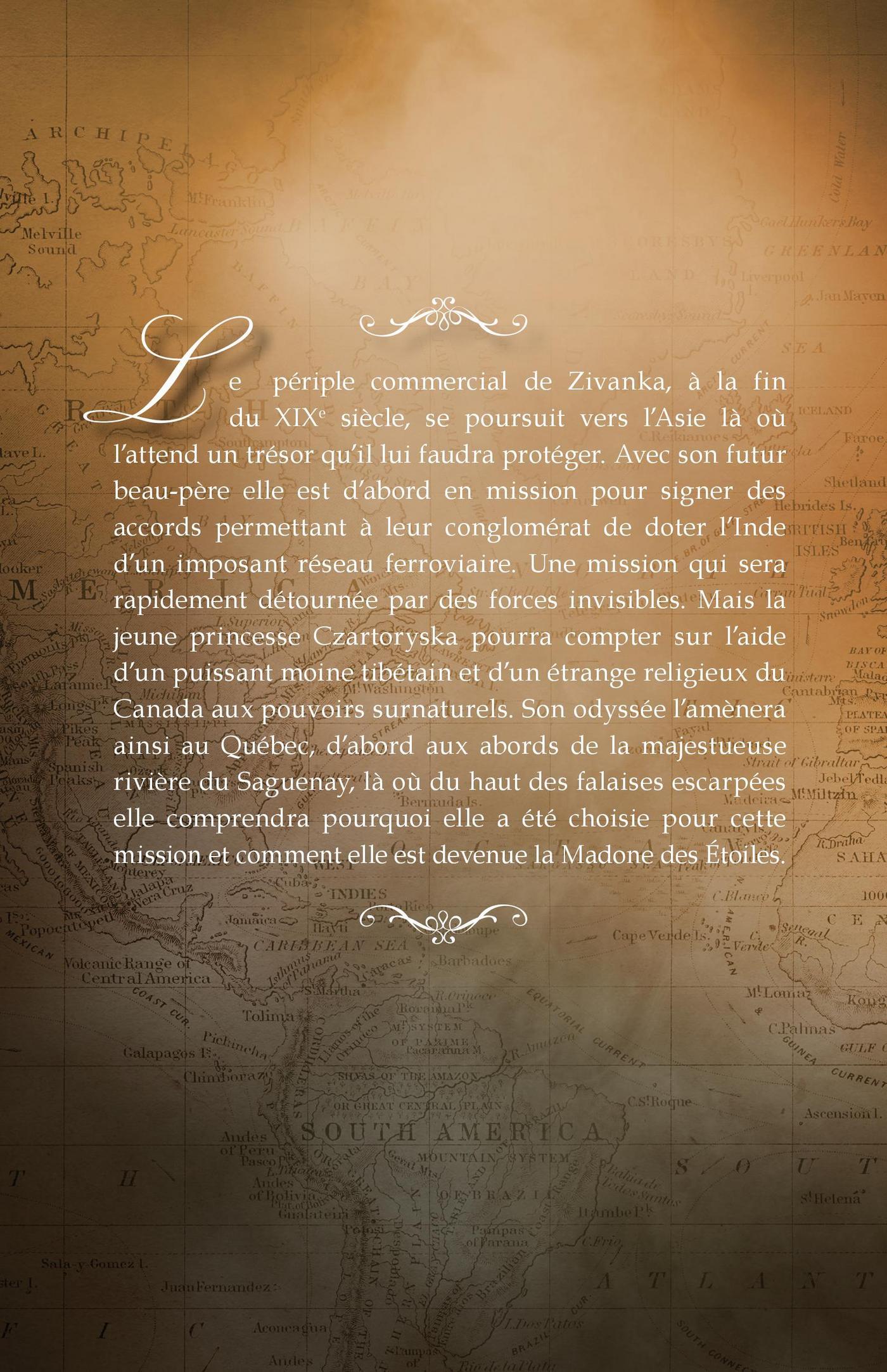 Le périple commercial de Zivanka, à la fin du XIXe siècle, se poursuit vers l’Asie là où l’attend un trésor qu’il lui faudra protéger. Avec son futur beau-père elle est d’abord en mission pour signer des accords permettant à leur conglomérat doter l’Inde d’un imposant réseau ferroviaire. Une mission qui sera rapidement détournée par des forces invisibles. Mais la jeune princesse de Czartoryska pourra compter sur l’aide d’unpuissant moine tibétain et d’un étrange religieux du Canada aux pouvoirs surnaturels. Son odyssée l’amènera ainsi au Québec, d’abord aux abords de la majestueuse rivière du Saguenay, là où du haut des falaises escarpées elle comprendra pourquoi elle a été choisie pour cette mission et comment elle est devenue la Madone des Étoiles.
