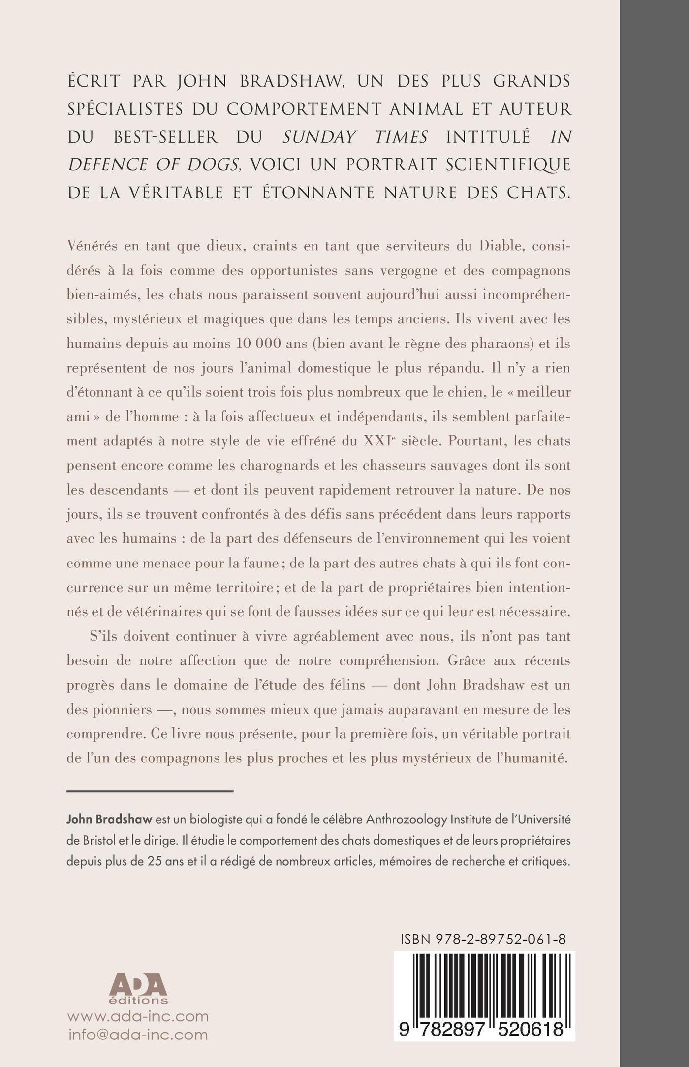 Vénérés en tant que dieux, craints en tant que serviteurs du Diable, considérés à la fois comme des opportunistes sans vergogne et des compagnons bien-aimés, les chats nous paraissent souvent aujourd’hui aussi incompréhensibles, mystérieux et géniaux que dans les temps anciens. Ils vivent avec les humains depuis au moins dix mille ans (bien avant le règne des pharaons) et ils représentent de nos jours l’animal domestique le plus répandu. Il n’y a rien d’étonnant à ce qu’ils soient trois plus nombreux que le chien, le «meilleur ami» de l’homme: à la fois affectueux et indépendants, ils semblent parfaitement adaptés à notre style de vie effréné du XXIe siècle. Pourtant, les chats pensent encore comme les charognards et les chasseurs sauvages dont ils sont les descendants — et dont ils peuvent rapidement retrouver la nature. De nos jours, ils se trouvent confrontés à des défis sans précédent dans leurs rapports avec les humains: de la part des défenseurs de l’environnement qui les voient comme une menace pour la faune; de la part des autres chats à qui ils font concurrence sur un même territoire; et de la part de propriétaires bien intentionnés et de vétérinaires qui se font de fausses idées sur ce qui leur est nécessaire. S’ils doivent continuer à vivre agréablement avec nous, ils n’ont pas tant besoin de notre affection que de notre compréhension. Grâce aux récents progrès dans le domaine de l’étude des félins — dont John Bradshaw est un des pionniers — nous sommes mieux que jamais auparavant en mesure de les comprendre. Ce livre nous présente pour la première fois un véritable portrait de l’un des compagnonsles plus proches et les plus mystérieux de l’humanité.