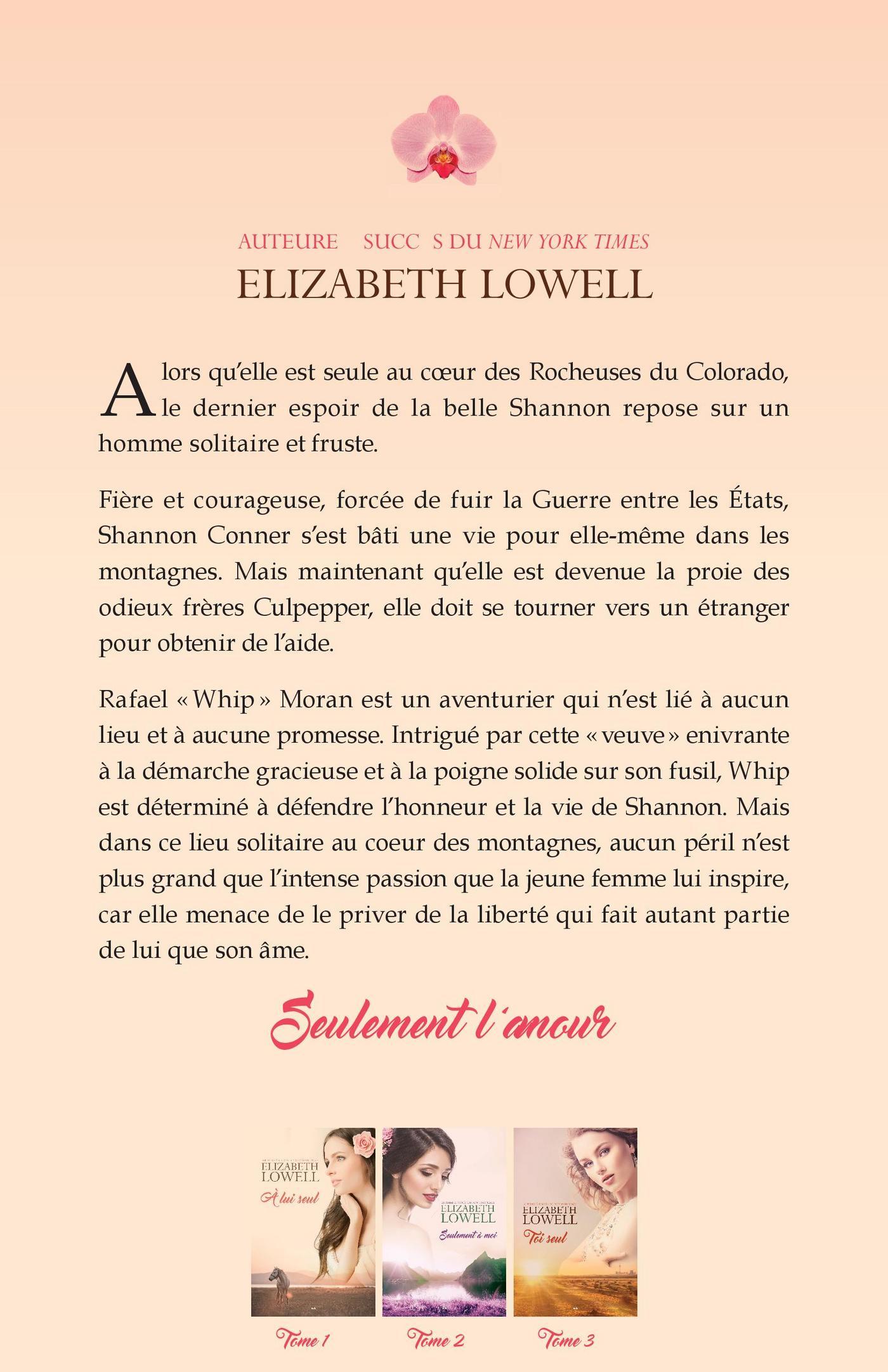 Seule au coeur des montagnes Rocheuses du Colorado, le dernier espoir de la belle Shannon repose sur un homme solitaire et frustre.Fière et courageuse, forcée de fuir la Guerre entre les États, Shannon Conner s’est bâtie une vie pour elle-même dans les montagnes. Mais maintenant qu’elle est devenue la proie des odieux frères Culpepper, elle doit se tourner vers un étranger pour obtenir de l’aide.Rafael «Whip» Moran est un aventurier qui n’est lié à aucun lieu et à aucune promesse. Intrigué par cette «veuve» enivrante à la démarche gracieuse et à poigne solide sur son fusil, Whip est déterminé à défendre l’honneur et la vie de Shannon. Mais dans ce lieu solitaire au coeur des montagnes, aucun péril n’est plus grand que l’intense passion que la jeune femme lui inspire car elle menace le priver de la liberté qui fait autant partie de lui que son âme.