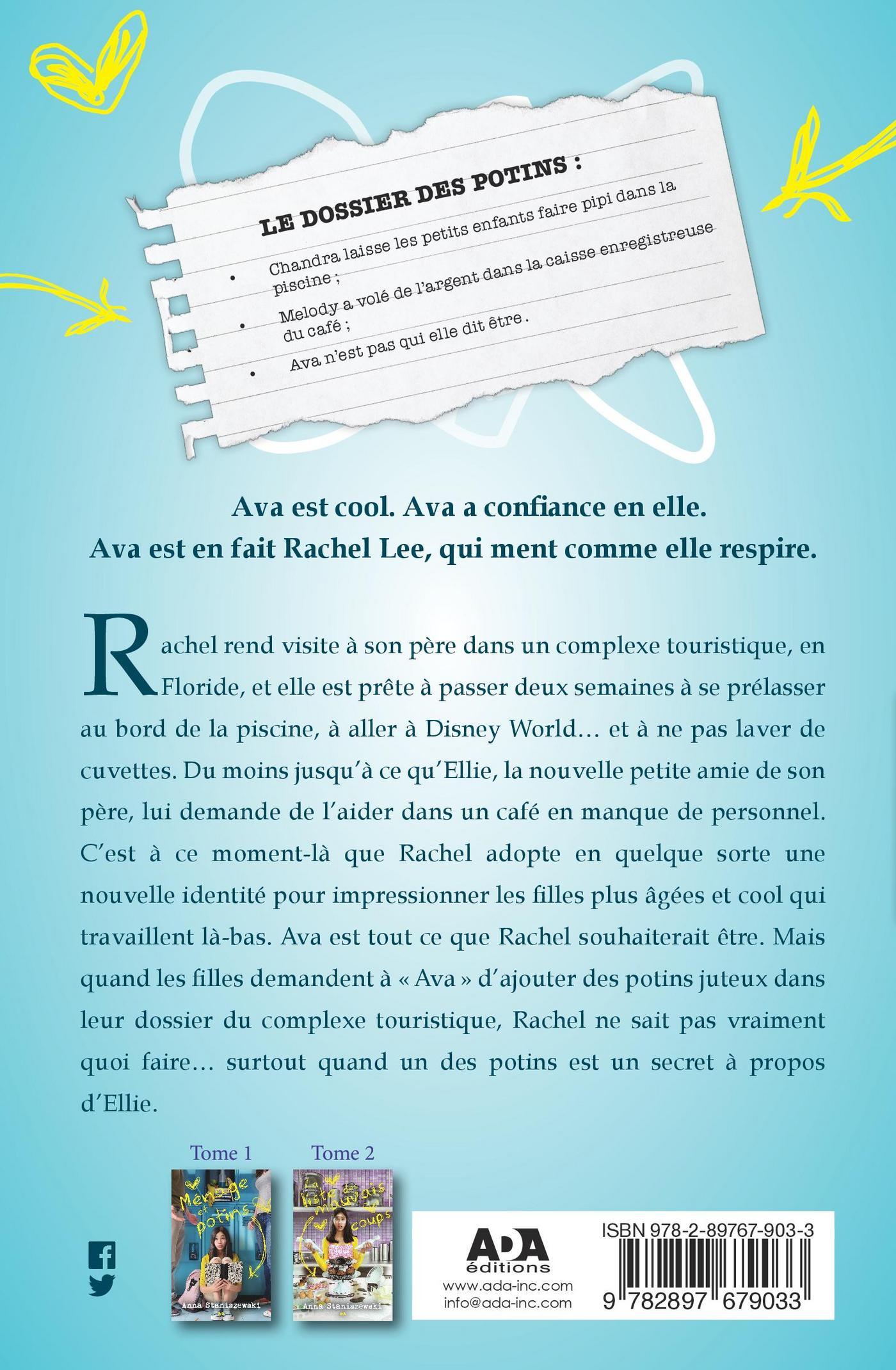 Rachel rend visite à son père dans un complexe touristique, en Floride, et elle est prête à passer deux semaines à se prélasser au bord de la piscine, à aller à Disney World — et à ne pas laver de cuvettes. Du moins jusqu’à ce qu’Ellie, la nouvelle petite amie de son père, lui demande de l’aider dans un café en manque de personnel. C’est à ce moment-là que Rachel adopte en quelque sorte une nouvelle identité pour impressionner les filles plus âgées et cool qui travaillent là-bas. Ava est tout ce que Rachel souhaiterait être. Mais quand les filles demandent à «Ava» d’ajouter des potins juteux dans leur dossier du complexe touristique, Rachel ne sait pas vraiment quoi faire… surtout quand un des potins est un secret à propos d’Ellie.