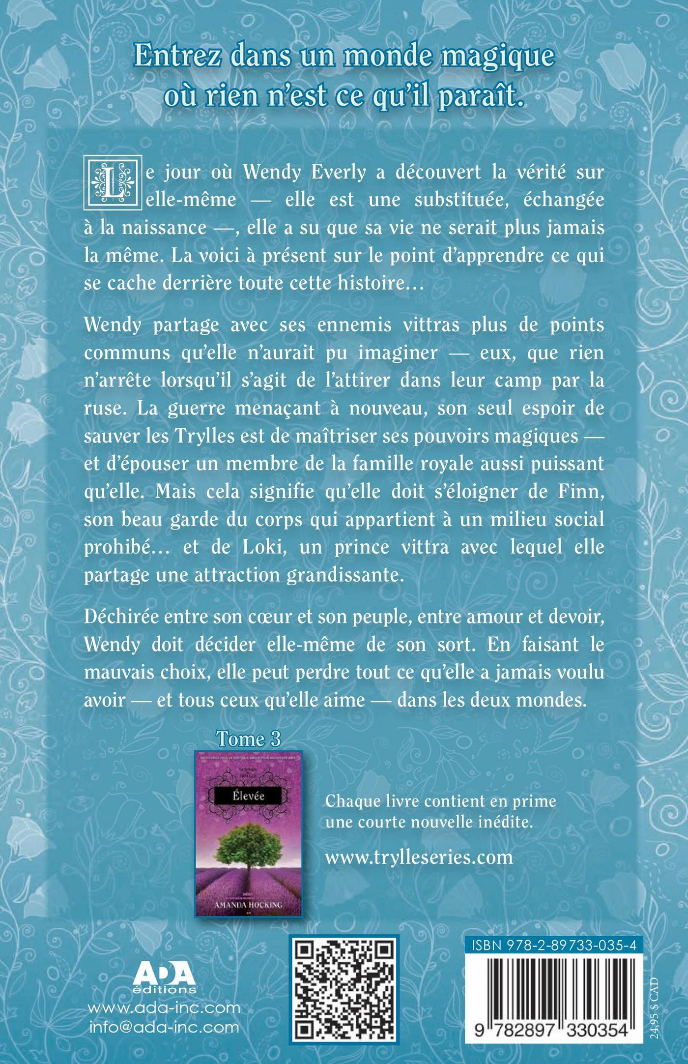 Le jour où Wendy Everly découvrit la vérité sur elle-même — elle est une substituée, échangée à la naissance —, elle sut que sa vie ne serait plus jamais la même. La voici à présent sur le point d’apprendre ce qui se cache derrière toute cette histoire… Wendy partage avec ses ennemis Vittra plus de points communs qu’elle n’aurait pu imaginer — eux, que rien n’arrête lorsqu’il s’agit de l’attirer dans leur camp par la ruse. La guerre menaçant à nouveau, son seul espoir de sauver les Trylles est de maîtriser ses pouvoirs magiques — etd’épouser un membre de la famille royale aussi puissant qu’elle. Mais cela signifie qu’elle doit s’éloigner de Finn, son beau garde du corps qui appartient à un milieu social prohibé… et de Loki, un prince Vittra avec lequel elle partage une attraction grandissante. Déchirée entre son coeur et son peuple, entre amour et devoir, Wendy doit décider elle-même de son sort. En faisant le mauvais choix, elle peut perdre tout ce qu’elle a jamais voulu avoir — et tous ceux qu’elle aime —… dans les deux mondes.