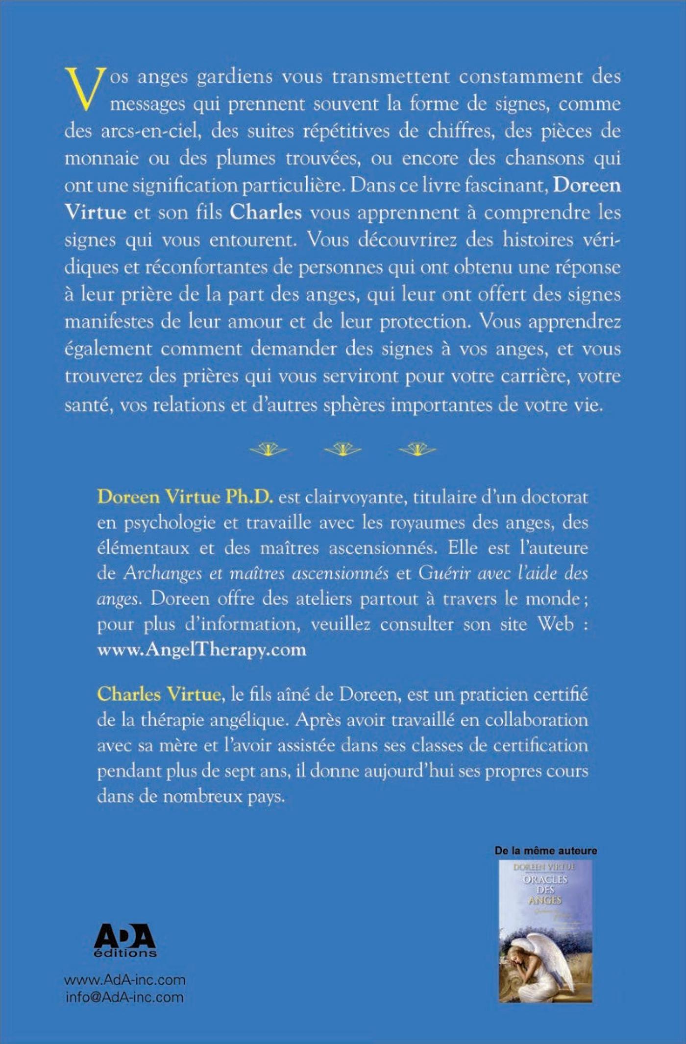 Vos anges gardiens vous transmettent constamment des messages qui prennent souvent la forme de signes, comme des arcs-en-ciel, des suites répétitives de chiffres, des pièces de monnaie ou des plumes trouvées, ou encore des chansons qui ont une signification particulière. Dans ce livre fascinant, Doreen Virtue et son fils Charles vous apprennent à comprendre les signes qui vous entourent. Vous découvrirez des histoires véridiques et réconfortantes de personnes qui ont obtenu une réponse à leur prière de la part des anges, en leur offrant des signes manifestes de leur amour et de leur protection. Vous apprendrez également comment demander des signes à vos anges, et vous trouverez des prières qui vous serviront pour votre carrière, votre santé, vos relations et d’autres sphères importantes de votre vie.